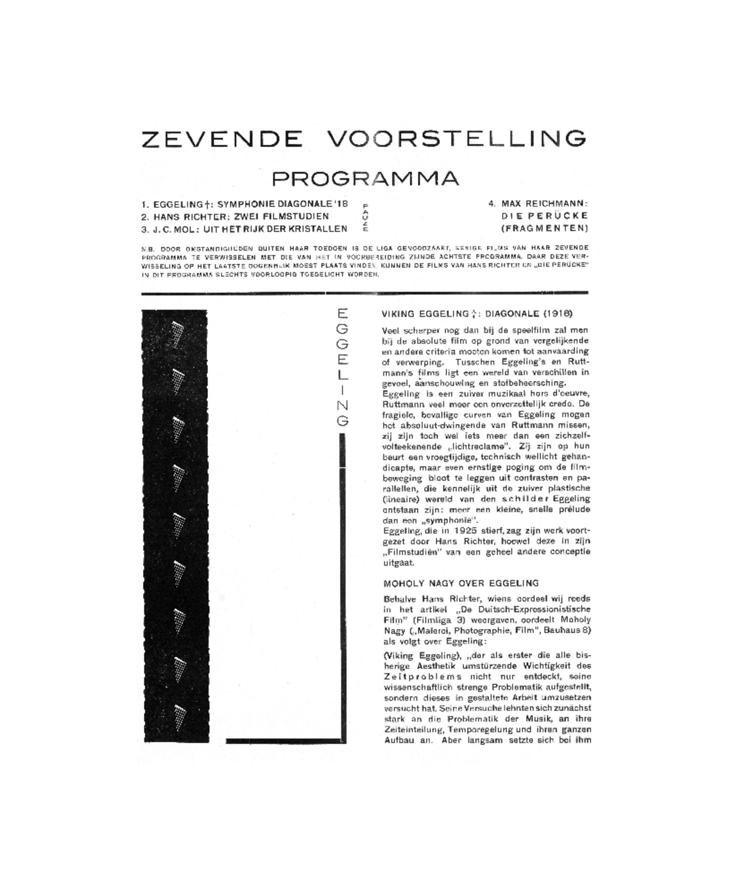 N.B. DOOR OMSTANDIGHEDEN BUITEN HAAR TOEDOEN IS DE LIGA GENOODZAAKT, EENIGE FILMS VAN HAAR ZEVENDE PROGRAMMA TE VERWISSELEN MET DIE VAN HET IN VOORBEREIDING ZIJNDE ACHTSTE PROGRAMMA. DAAR DEZE VERWISSELING OP HET LAATSTE OOGENBLIK MOEST PLAATS VINDEN, KUNNEN DE FILMS VAN HANS RICHTER EN ‘DIE PERÜCKE’ IN DIT PROGRAMMA SLECHTS VOORLOOPIG TOEGELICHT WORDEN.