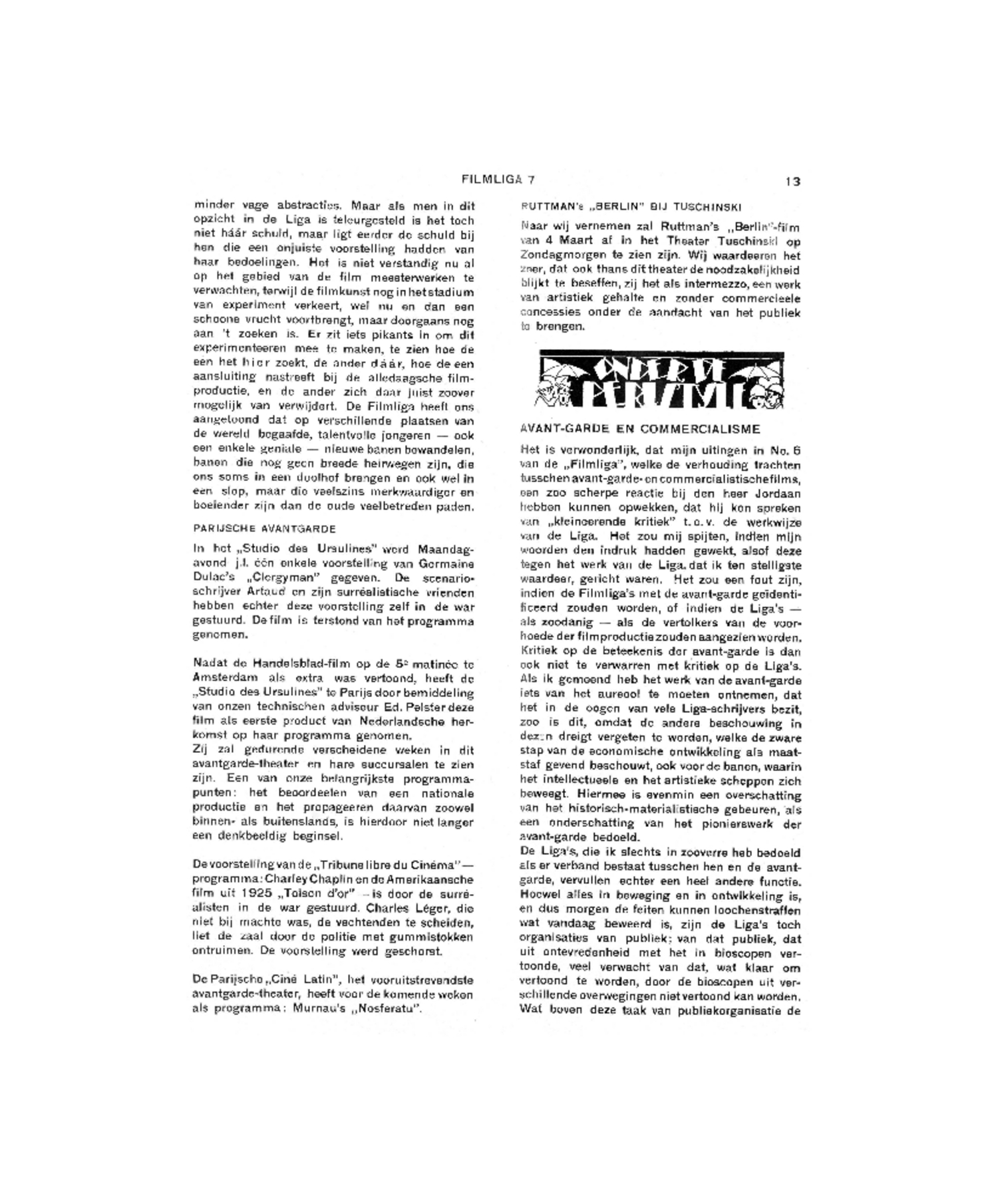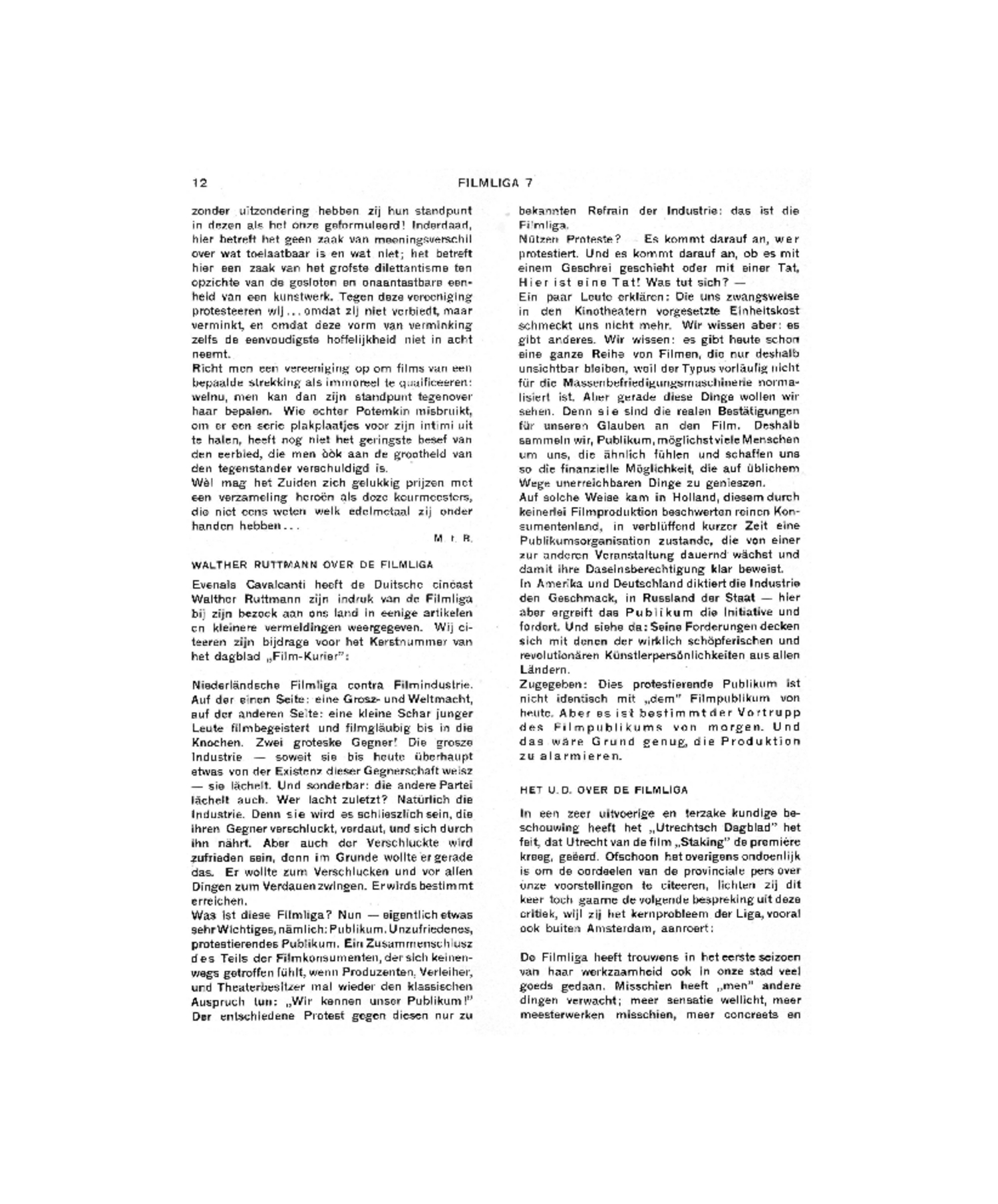 Evenals Cavalcanti heeft de Duitsche cinéast Walther Ruttmann zijn indruk van de Filmliga bij zijn bezoek aan ons land in eenige artikelen en kleinere vermeldingen weergegeven. Wij citeeren zijn bijdrage voor het Kerstnummer van het dagblad ‘Film-Kurier’: