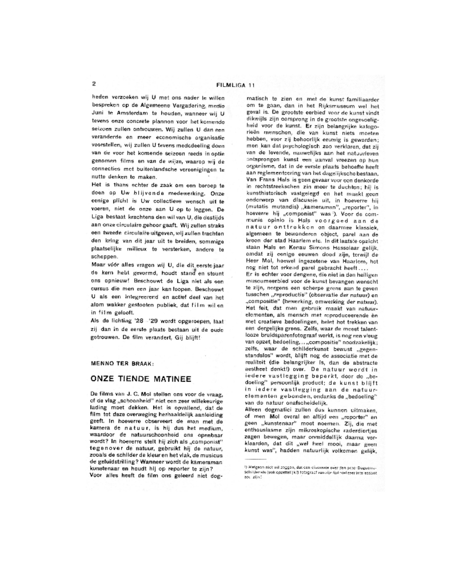 De films van J.C. Mol stellen ons voor de vraag, of de vlag ‘schoonheid’ niet een zeer willekeurige lading moet dekken. Het is opvallend, dat de film tot deze overweging herhaaldelijk aanleiding geeft. In hoeverre observeert de man met de kamera de natuur, is hij dus het medium, waardoor de natuurschoonheid ons openbaar wordt? In hoeverre stelt hij zich als ‘componist’ tegenover de natuur, gebruikt hij de natuur, zooals de schilder de kleur en het vlak, de musicus de geluidstrilling? Wanneer wordt de kameraman kunstenaar en houdt hij op reporter te zijn?