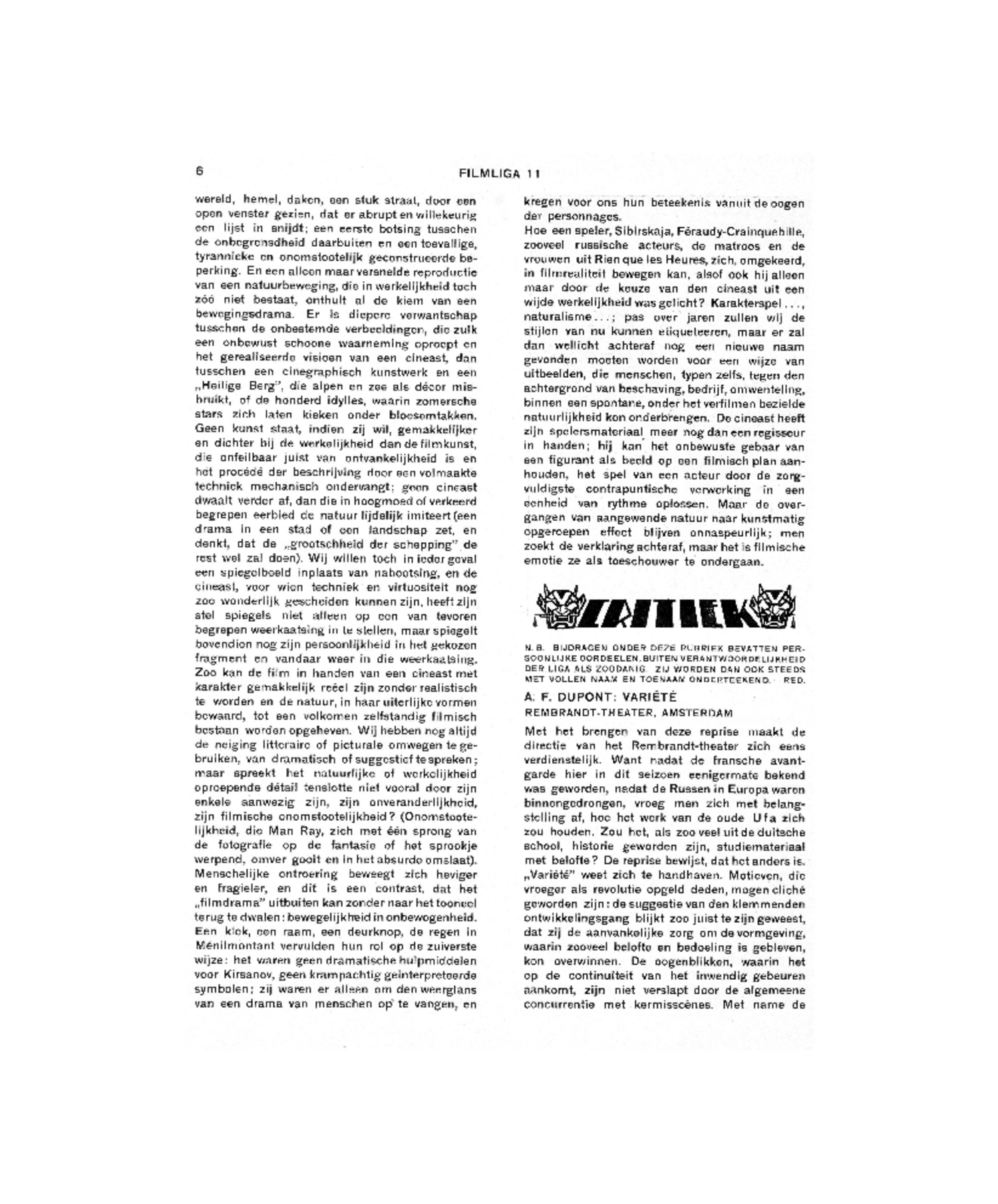 Met het brengen van deze reprise maakt de directie van het Rembrandt-theater zich eens verdienstelijk. Want nadat de fransche avantgarde hier in dit seizoen eenigermate bekend was geworden, nadat de Russen in Europa waren binnengedrongen, vroeg men zich met belangstelling af, hoe het werk van de oude Ufa zich zou houden. Zou het, als zoo veel uit de duitsche school, historie geworden zijn, studiemateriaal met belofte? De reprise bewijst, dat het anders is. ‘Variété’ weet zich te handhaven. Motieven, die vroeger als revolutie opgeld deden, mogen cliché geworden zijn: de suggestie van den klemmenden ontwikkelingsgang blijkt zoo juist te zijn geweest, dat zij de aanvankelijke zorg om de vormgeving, waarin zooveel belofte en bedoeling is gebleven, kon overwinnen. De oogenblikken, waarin het op de continuïteit van het inwendig gebeuren aankomt, zijn niet verslapt door de algemeene concurrentie met kermisscènes. Met name de