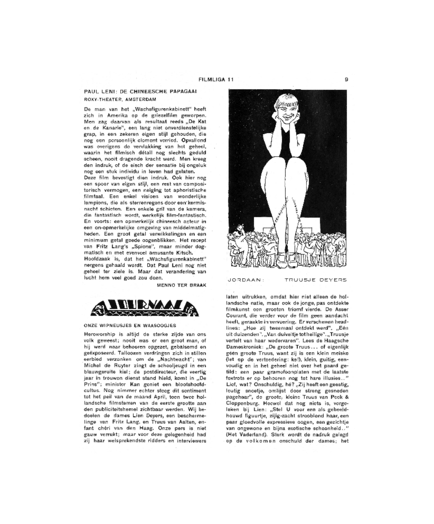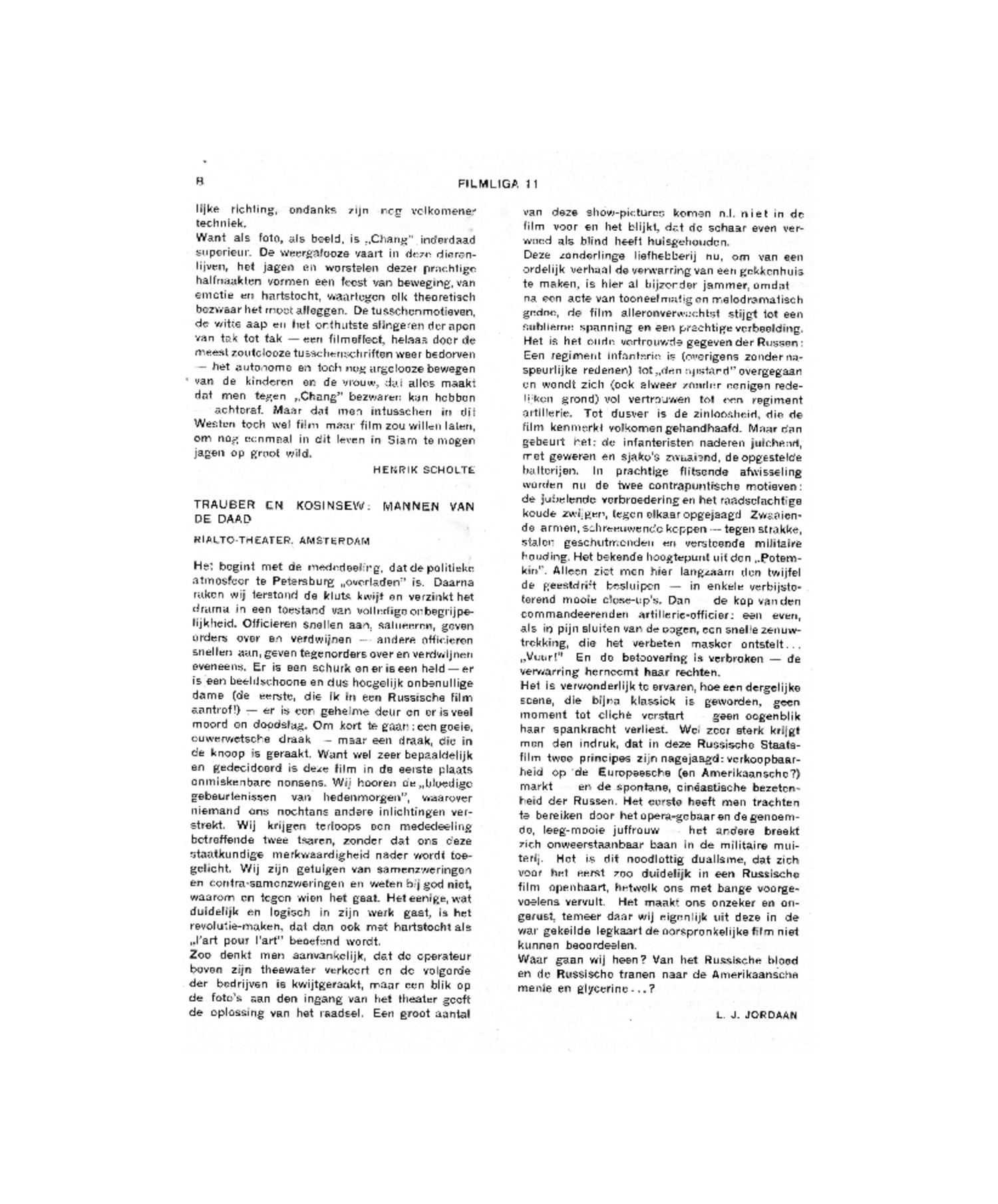 En zijn niet minder bekende en niet minder alzijdige frère-compagnon uit Het Volk, C. de Dood, stond hem daarin bij door opnieuw te verklaren, dat een jaar werken van de Filmliga met zijn boerenbedrogfilms ‘volledig tot een onbenulligheid gemaakt wordt, als Tuschinsky één keer zoo'n film draait’.