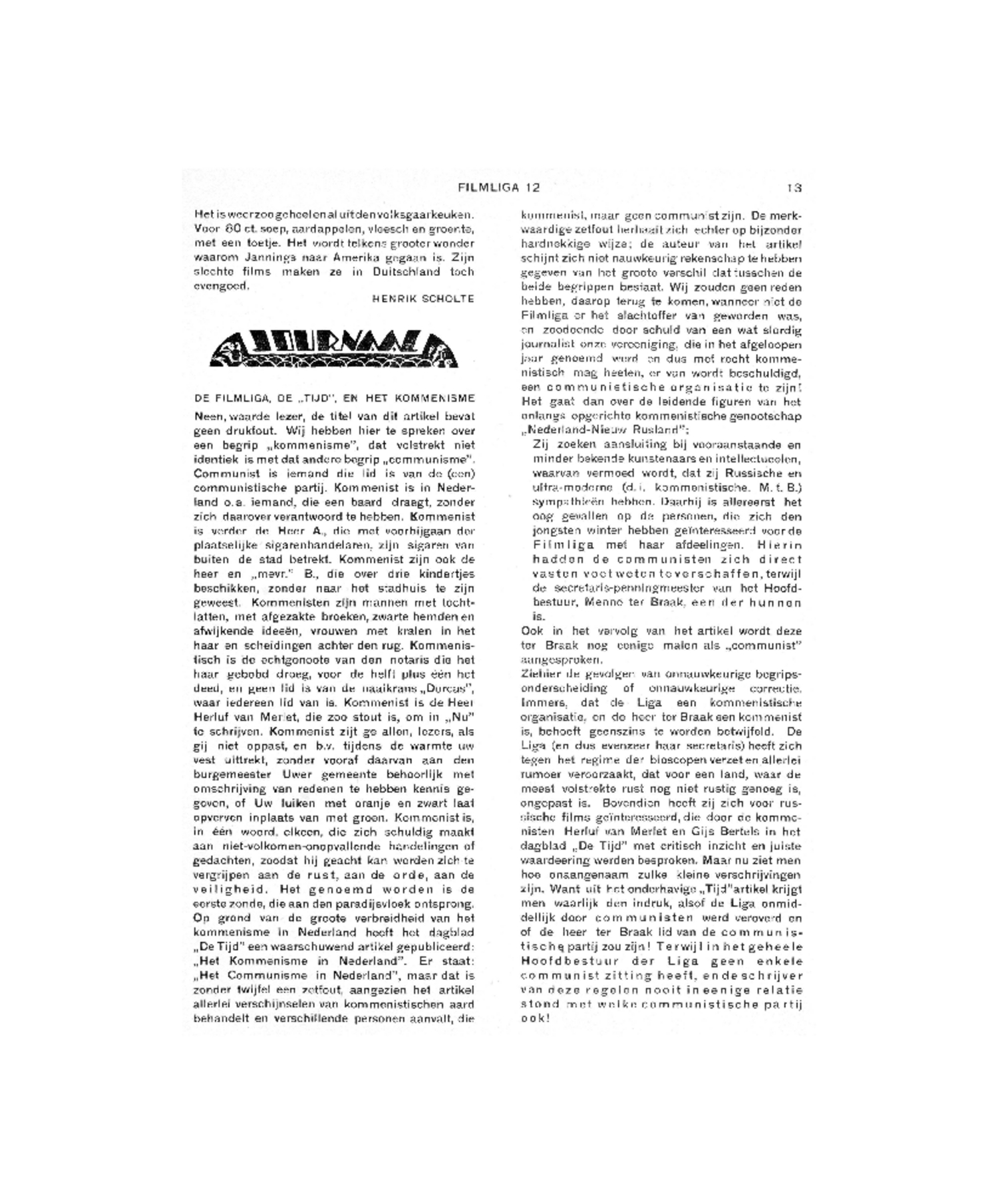 Ziehier de gevolgen van onnauwkeurige begripsonderscheiding of onnauwkeurige correctie. Immers, dat de Liga een kommenistische organisatie, en de heer ter Braak een kommenist is, behoeft geenszins te worden betwijfeld. De Liga (en dus evenzeer haar secretaris) heeft zich tegen het regime der bioscopen verzet en allerlei rumoer veroorzaakt, dat voor een land, waar de meest volstrekte rust nog niet rustig genoeg is, ongepast is. Bovendien heeft zij zich voor russische films geïnteresseerd, die door de kommenisten Herluf van Merlet en Gijs Bertels in het dagblad ‘De Tijd’ met critisch inzicht en juiste waardeering werden besproken. Maar nu ziet men hoe onaangenaam zulke kleine verschrijvingen zijn. Want uit het onderhavige ‘Tijd’ artikel krijgt men waarlijk den indruk, alsof de Liga onmiddellijk door communisten werd veroverd en of de heer ter Braak lid van de communistische partij zou zijn! Terwijl in het geheele Hoofdbestuur der Liga geen enkele communist zitting heeft, en de schrijver van deze regelen nooit in eenige relatie stond met welke communistische partij ook!