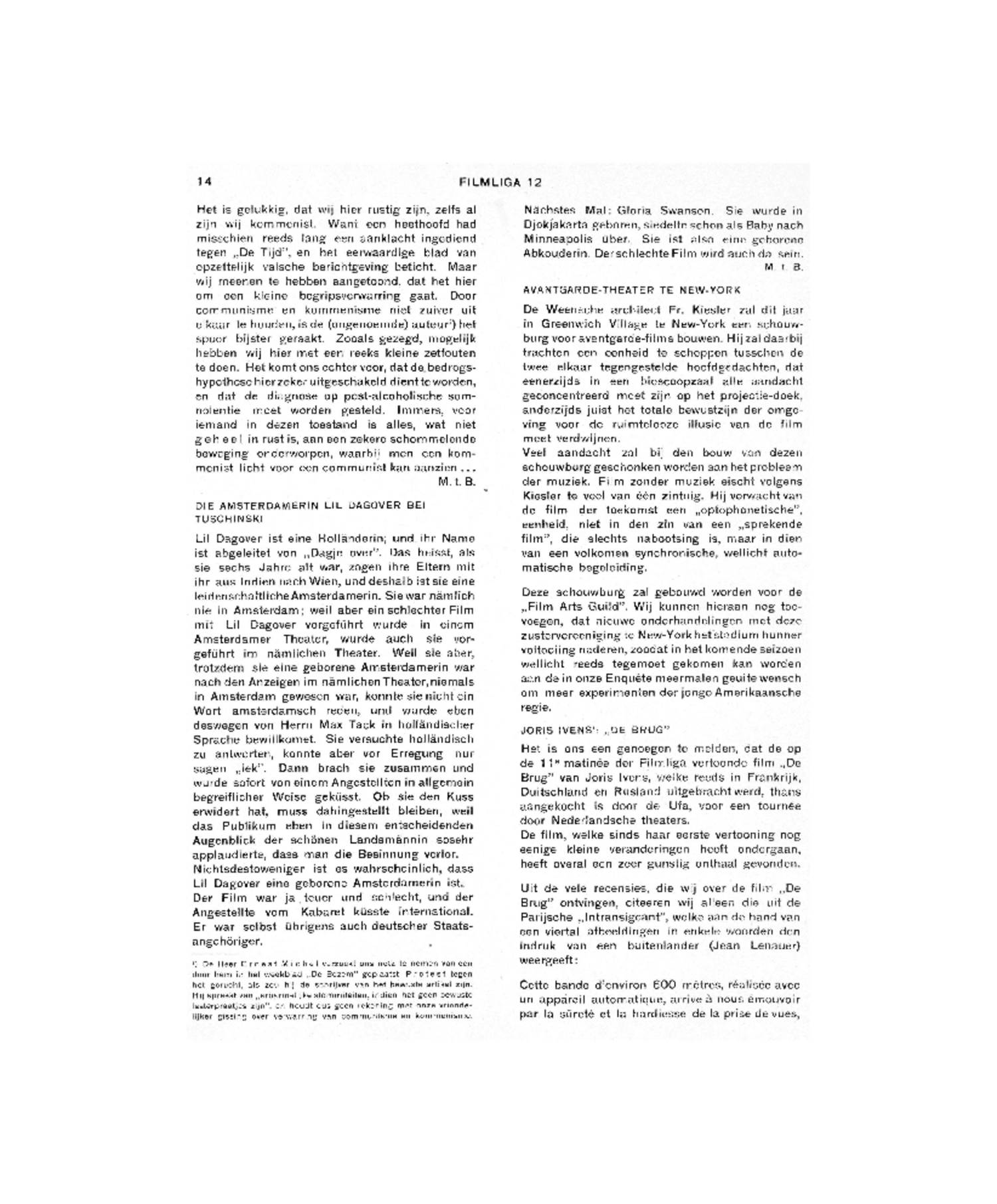 Het is ons een genoegen te melden, dat de op de 11e matinée der Filmliga vertoonde film ‘De Brug’ van Joris Ivens, welke reeds in Frankrijk, Duitschland en Rusland uitgebracht werd, thans aangekocht is door de Ufa, voor een tournée door Nederlandsche theaters.