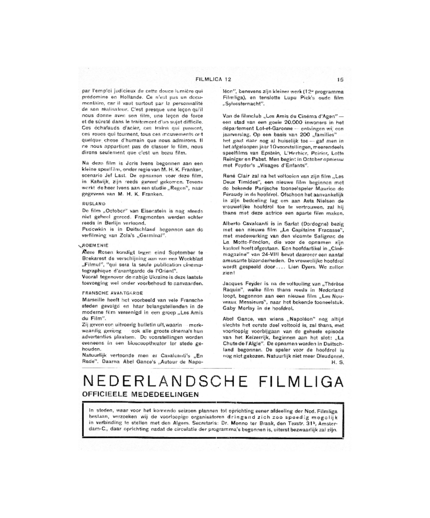 Van de filmclub ‘Les Amis du Cinéma d'Agen’ - een stad van een goeie 20.000 inwoners in het département Lot-et-Garonne - ontvingen wij een jaarverslag. Op een basis van 200 ‘families’ - het gaat daar nog al huiselijk toe - gaf men in het afgeloopen jaar 10 voorstellingen, meerendeels speelfilms van Epstein, L'Herbier, Poirier, Lotte Reiniger en Pabst. Men begint in October opnieuw met Feyder's ‘Visages d'Enfants’.