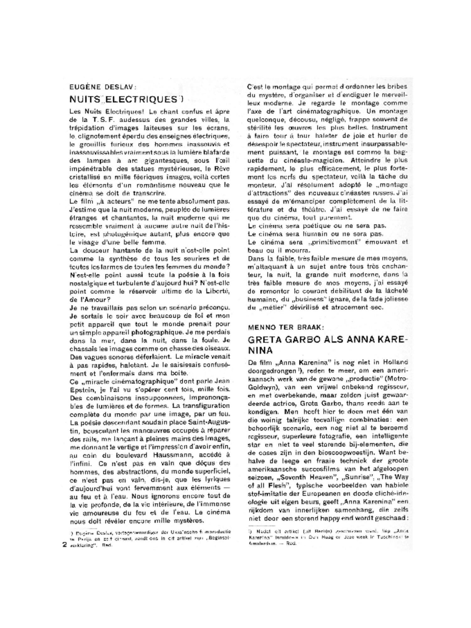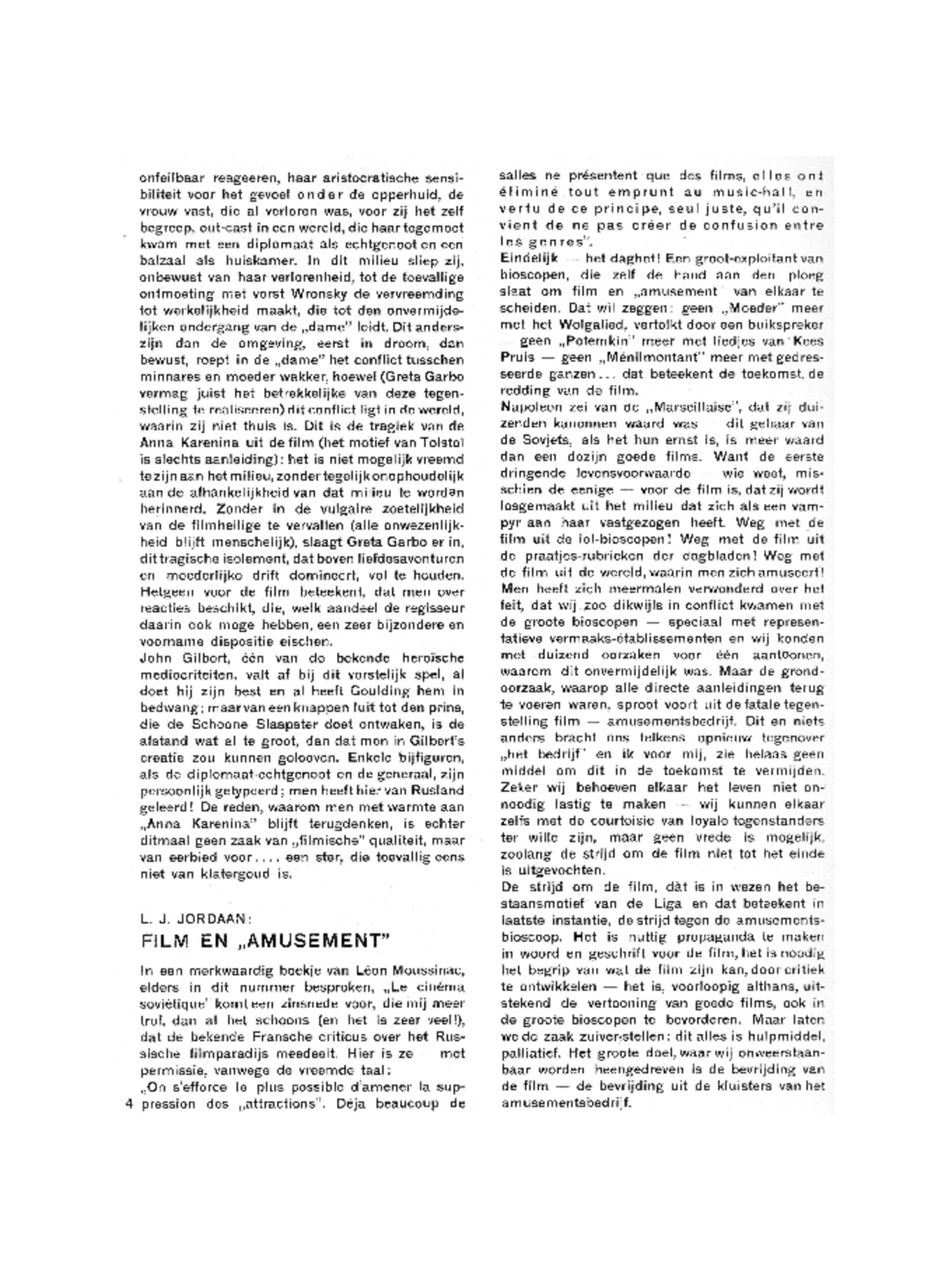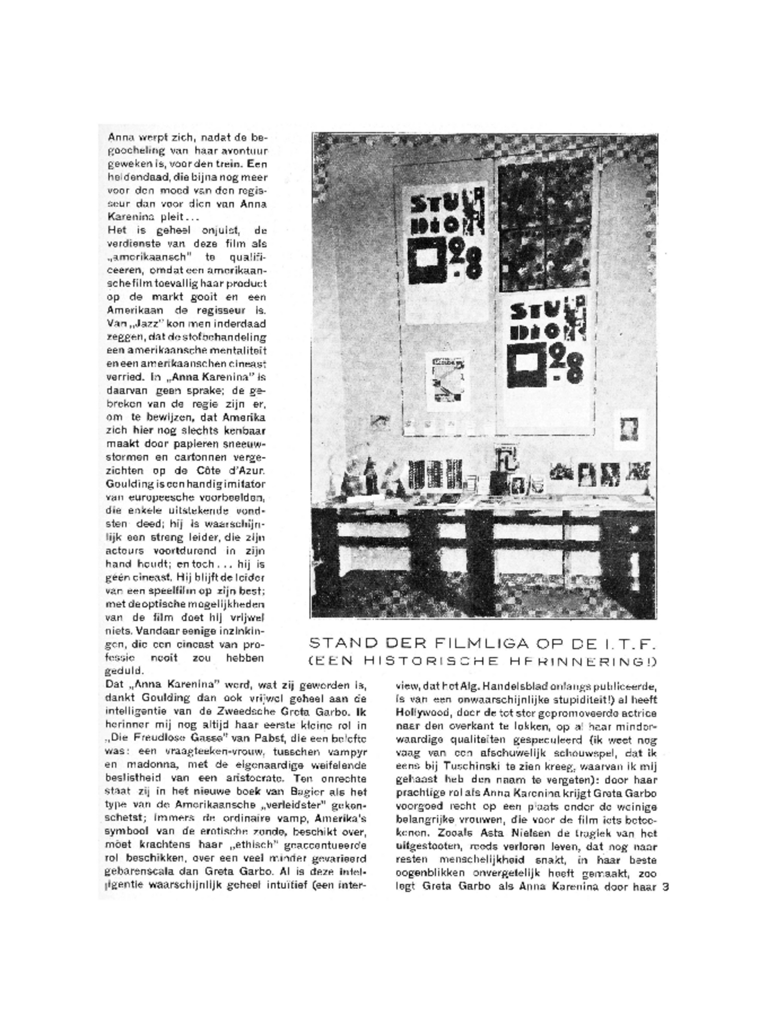 Het is geheel onjuist, de verdienste van deze film als ‘amerikaansch’ te qualificeeren, omdat een amerikaanschefilm toevallig haar product op de markt gooit en een Amerikaan de regisseur is. Van ‘Jazz’ kon men inderdaad zeggen, dat de stofbehandeling een amerikaansche mentaliteit en een amerikaanschen cineast verried. In ‘Anna Karenina’ is daarvan geen sprake; de gebreken van de regie zijn er, om te bewijzen, dat Amerika zich hier nog slechts kenbaar maakt door papieren sneeuwstormen en cartonnen vergezichten op de Côte d'Azur. Goulding is een handig imitator van europeesche voorbeelden, die enkele uitstekende vondsten deed; hij is waarschijnlijk een streng leider, die zijn acteurs voortdurend in zijn hand houdt; en toch...hij is géén cineast. Hij blijft de leider van een speelfilm op zijn best; met de optische mogelijkheden van de film doet hij vrijwel niets. Vandaar eenige inzinkingen, die een cineast van professie nooit zou hebben geduld.