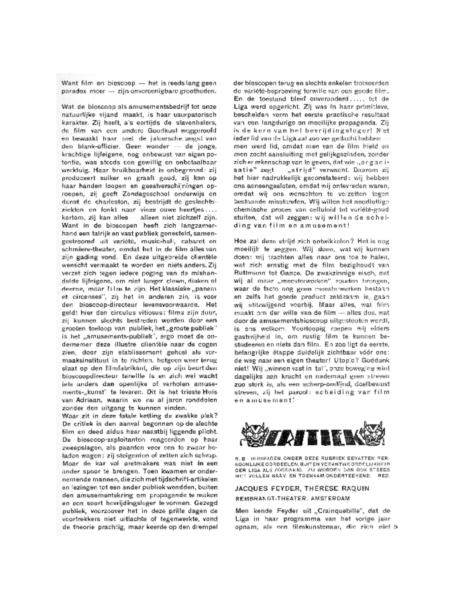 Men kende Feyder uit ‘Crainquebille’, dat de Liga in haar programma van het vorige jaar opnam, als een filmkunstenaar, die zich niet