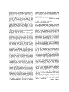 der filmkunst, en niemand zal ze terugwenschen, tenzij men bijzonder op het avontuur van de kruistochten der toenmalige critiek gesteld is. Inmiddels heeft zich de z.g. ‘commercieele’ films bedriegelijk weten op te doffen, wat haar uiterlijk betreft, om aldus haar leeg en voos innerlijk wat salonfähiger te doen schijnen. Wij zien niet meer de gelatine, waaruit weleer de Roode Zee was samengestampt, en de lichtreclames, die Mozes, Joodsch agent der toenmalige General Motors, inspireerden tot tien overtuigende headlines, alias geboden, zijn van het uitspansel verdwenen. Alles is tegenwoordig flou-flou; import van europeesche filmsterren en regisseurs camoufleerde voortaan de banale movies-mentaliteit, die James Cruze in zijn parodie ‘Jazz’ zoo kostelijk bespot.