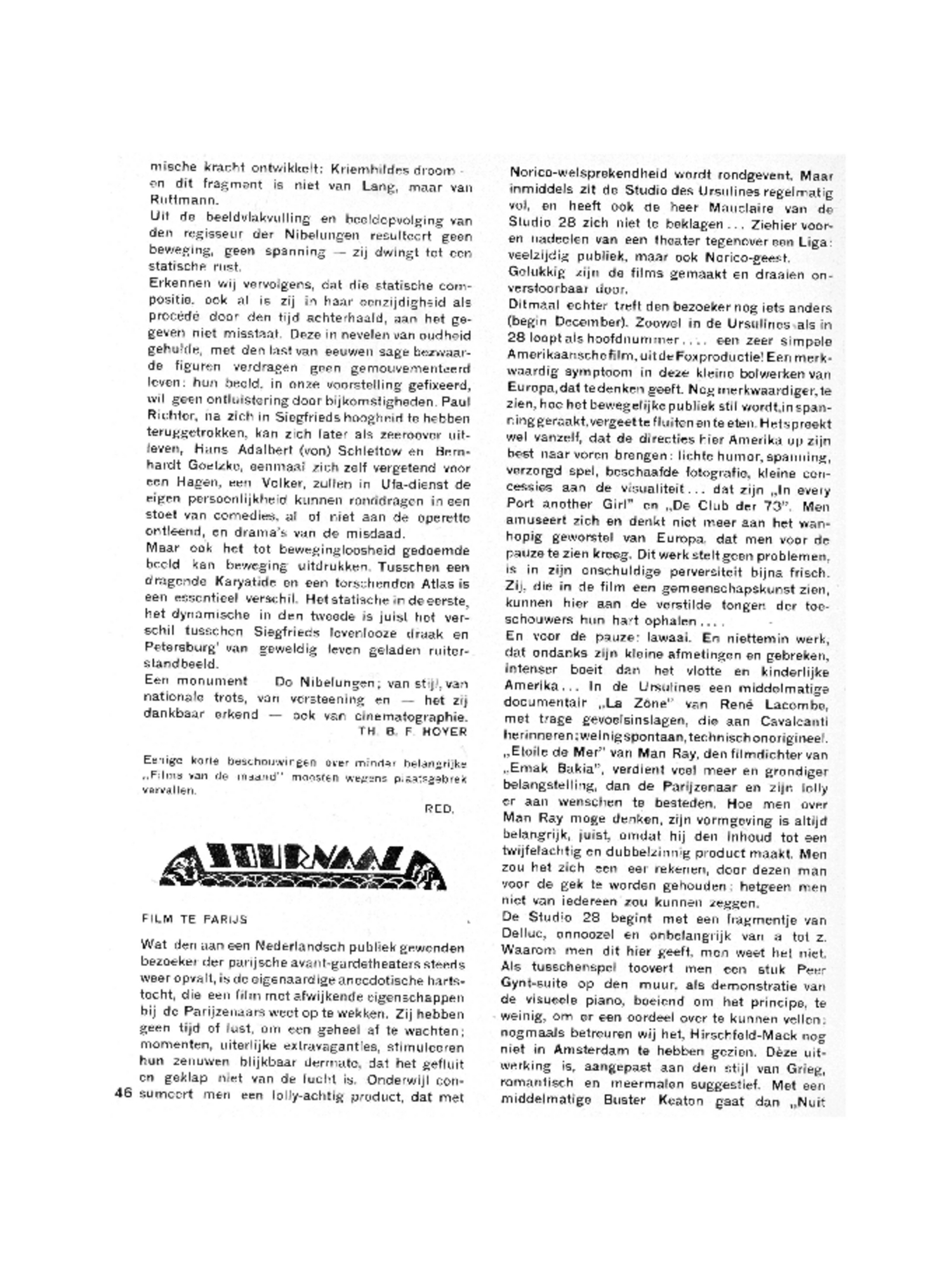 De Studio 28 begint met een fragmentje van Delluc, onnoozel en onbelangrijk van a tot z. Waarom men dit hier geeft, men weet het niet. Als tusschenspel toovert men een stuk Peer Gynt-suite op den muur, als demonstratie van de visueele piano, boeiend om het principe, te weinig, om er een oordeel over te kunnen vellen; nogmaals betreuren wij het, Hirschfeld-Mack nog niet in Amsterdam te hebben gezien. Dèze uitwerking is, aangepast aan den stijl van Grieg, romantisch en meermalen suggestief. Met een middelmatige Buster Keaton gaat dan ‘Nuit