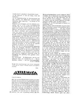 Ditmaal echter treft den bezoeker nog iets anders (begin December). Zoowel in de Ursulines als in 28 loopt als hoofdnummer....een zeer simpele Amerikaanschefilm, uit de Foxproductie! Een merkwaardig symptoom in deze kleine bolwerken van Europa, dat te denken geeft. Nog merkwaardiger, te zien, hoe het beweg elijke publiek stil wordt, in spanning geraakt, vergeet te fluiten en te eten. Het spreekt wel vanzelf, dat de directies hier Amerika op zijn best naar voren brengen: lichte humor, spanning, verzorgd spel, beschaafde fotografie, kleine concessies aan de visualiteit...dat zijn ‘In every Port another Girl’ en ‘De Club der 73’. Men amuseert zich en denkt niet meer aan het wanhopig geworstel van Europa, dat men voor de pauze te zien kreeg. Dit werk stelt geen problemen, is in zijn onschuldige perversiteit bijna frisch. Zij, die in de film een gemeenschapskunst zien, kunnen hier aan de verstilde tongen der toeschouwers hun hart ophalen....
