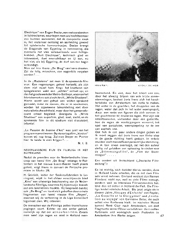 Electrique’ van Eugen Deslav, een reeksarabesken in lichtreclames, waartegen men als hoofdbezwaar zou kunnen aanvoeren, dat de compositie zwak is, het materiaal eentonig en aanleiding gevend tot spielerische kamera-trucjes. Deslav brengt de Diagonale van Eggeling in herinnering, die eveneens het vlak verwaarloosde voor lichtgekrabbel. ‘Nuit Electrique’, technisch glad en interessant, doet onvruchtbaar en ijl aan, nu het niet, als bij Eggeling, de durf van een begin verkondigt.
