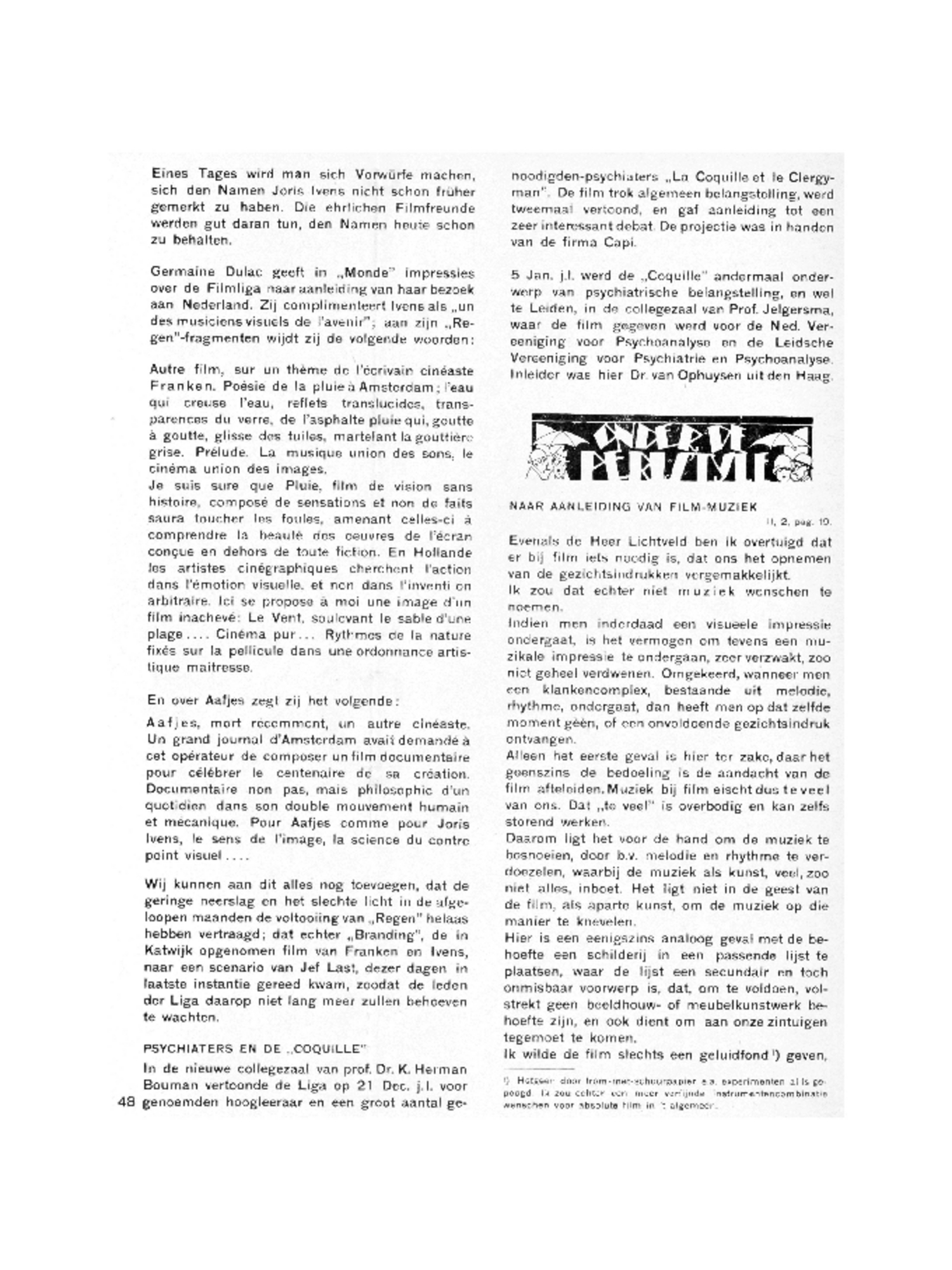 Germaine Dulac geeft in ‘Monde’ impressies over de Filmliga naar aanleiding van haar bezoek aan Nederland. Zij complimenteert Ivens als ‘un des musiciens visuels de l'avenir’; aan zijn ‘Regen’-fragmenten wijdt zij de volgende woorden: