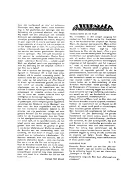 Men herinnert zich onwillekeurig het hoofdstuk ‘Totentanz’ uit ‘Der Zauberberg’, het geniale meesterwerk van dezen auteur, waarin hij zijn figuren confronteert met de bioscoop; ‘der Raum war vernichtet, die Zeit zurückgestellt, das Dort und Damals in ein huschendes, gaukelndes, von Musik umspieltes Hier und Jetzt verwandelt’. Maar hoe scherp deze opmerkingen ook de bioscoop mogen karakteriseeren, over het film-probleem zeggen zij weinig of niets, evenmin als de meening van Valéry. Omdat Mann waarschijnlijk wèl Alt-Heidelberg, maar nìet Ruttmann of Dulac gezien heeft!