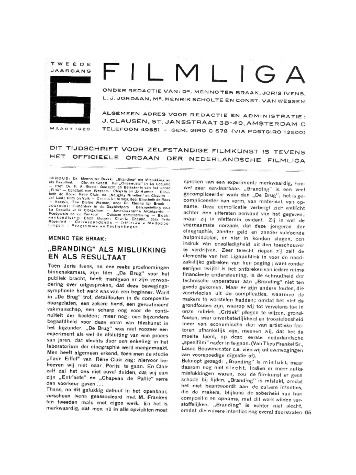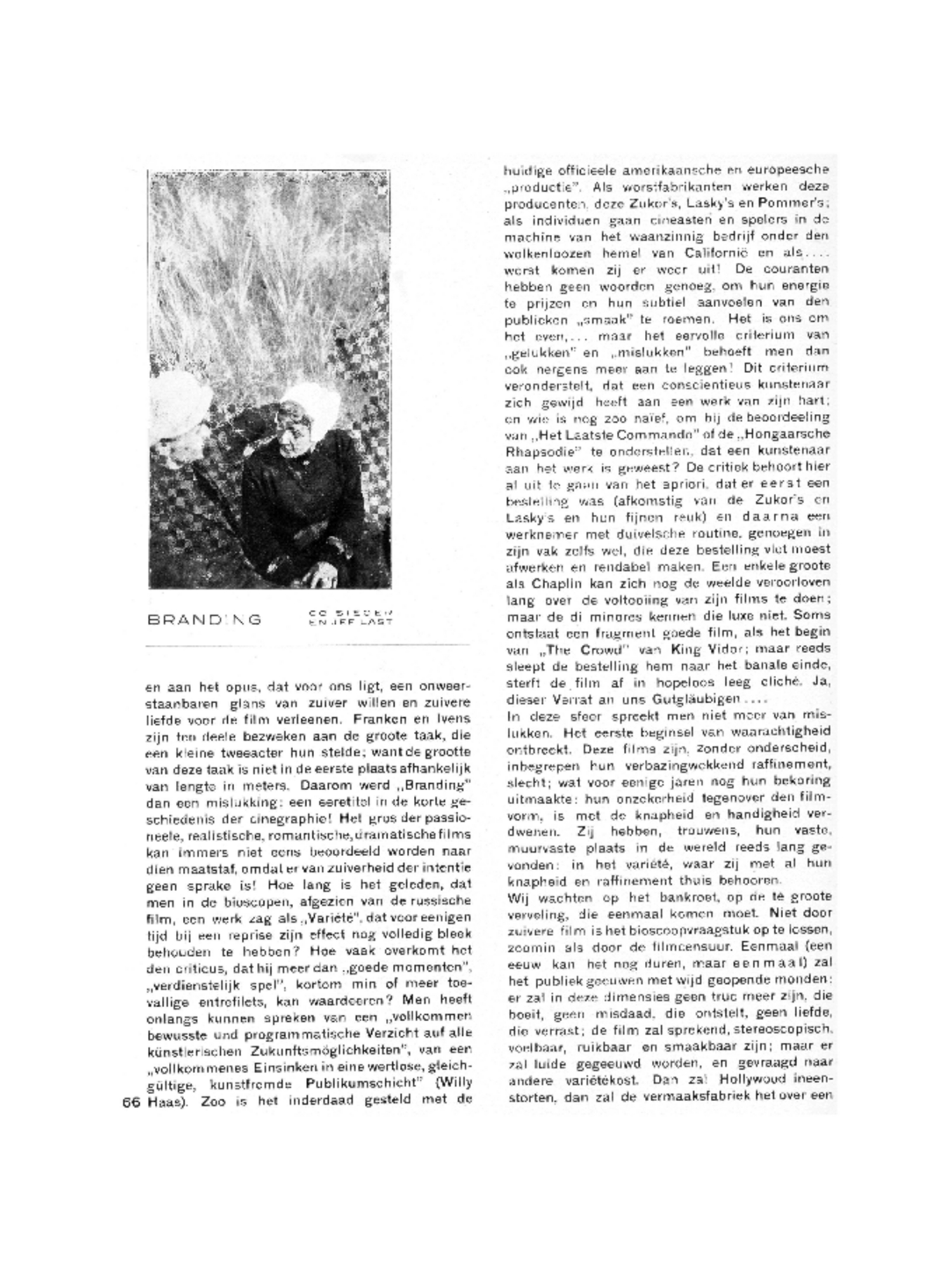 Wij zullen met opzet niet uitweiden over de belangrijke qualiteiten van ‘Branding’; niet stilstaan bij de resultaten: een onmiskenbare eigen hollandsche sfeer door even onmiskenbare russische invloeden heen, de kleine chefs d'oeuvre van Ivens' talent, de discipline der spelers, waarvan Last in expressiviteit echter te zeer tekortschoot, terwijl Hein Block en Co Sieger voortreffelijk voldeden. Wij wenschen deze film te verdedigen met zijn misluktheid; wat er treffend en praegnant was, heeft ieder filmgevoelige zelf ondergaan, zonder misschien terstond te realiseeren, wat de incongruentie van opzet en resultaat in dit geval waard was.