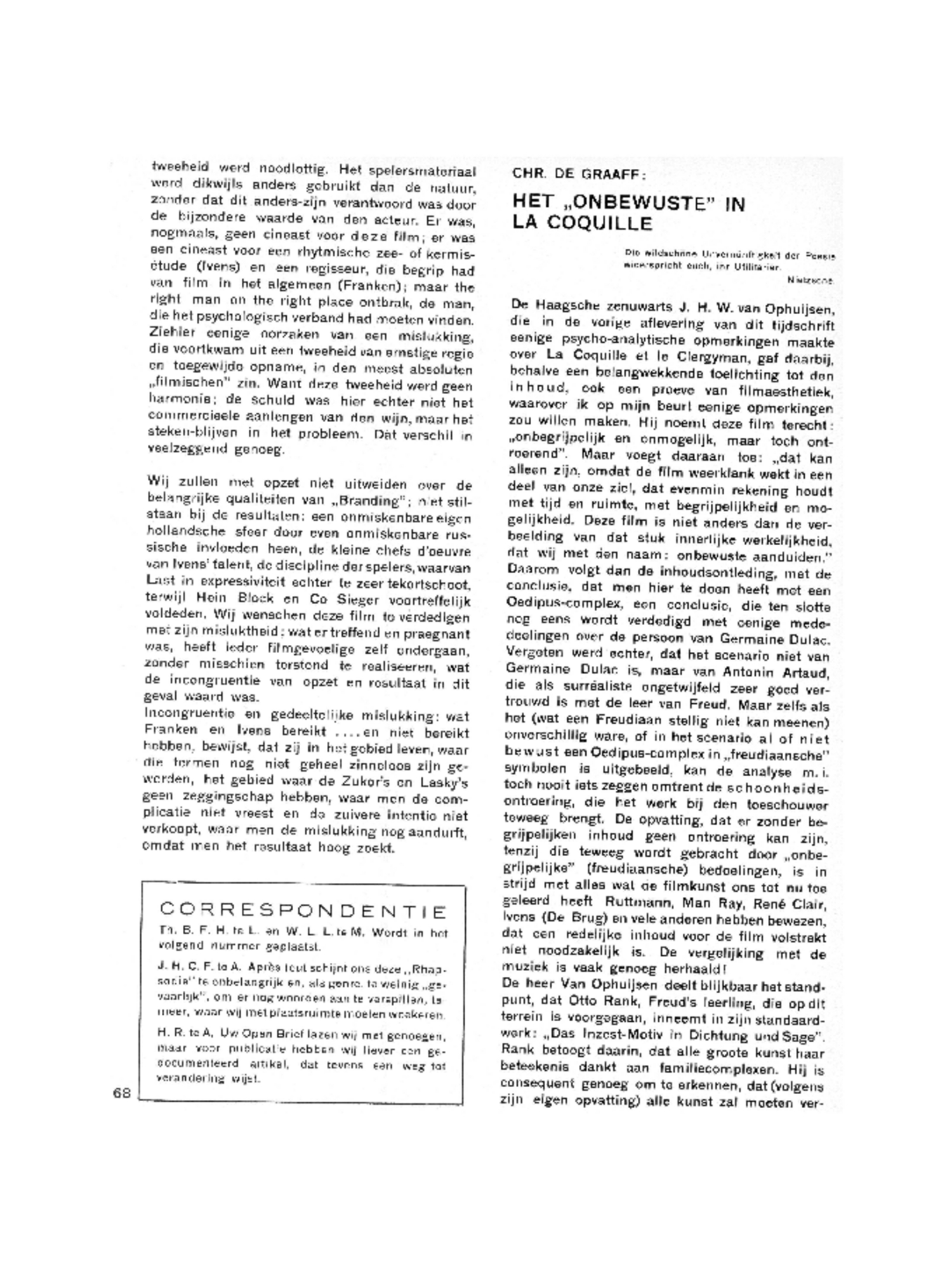 Hoofdfout is ongetwijfeld de onvoldoende beheersching van de psychologische symboliek. Noch Franken, de auteur van het pompeuze spel D 16 MM, waarin hij zich zeer zeker géén psycholoog toont, noch Ivens, de maker van ‘De Brug’, waarin hij de psychologie welbewust als middel versmaadde, bezaten blijkbaar de onfeilbare intuïtie, waarover b.v. Poedowkin, en op een geheel ander plan, Claude Autant Lara konden beschikken. Er heeft in dezen, de film bewijst het, geen leidende figuur, geen cìneast bestaan; wij herkennen al te duidelijk Ivens' persoonlijkheid in de visueele intermezzi, die opgenomen hadden moeten zijn in den gang van de zichtbare psychologische ontwikkeling, maar nu als meesterlijke fragmenten los bleven hangen. Wat ons van Franken bijblijft, is dit: een doelbewuste regie
