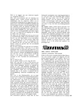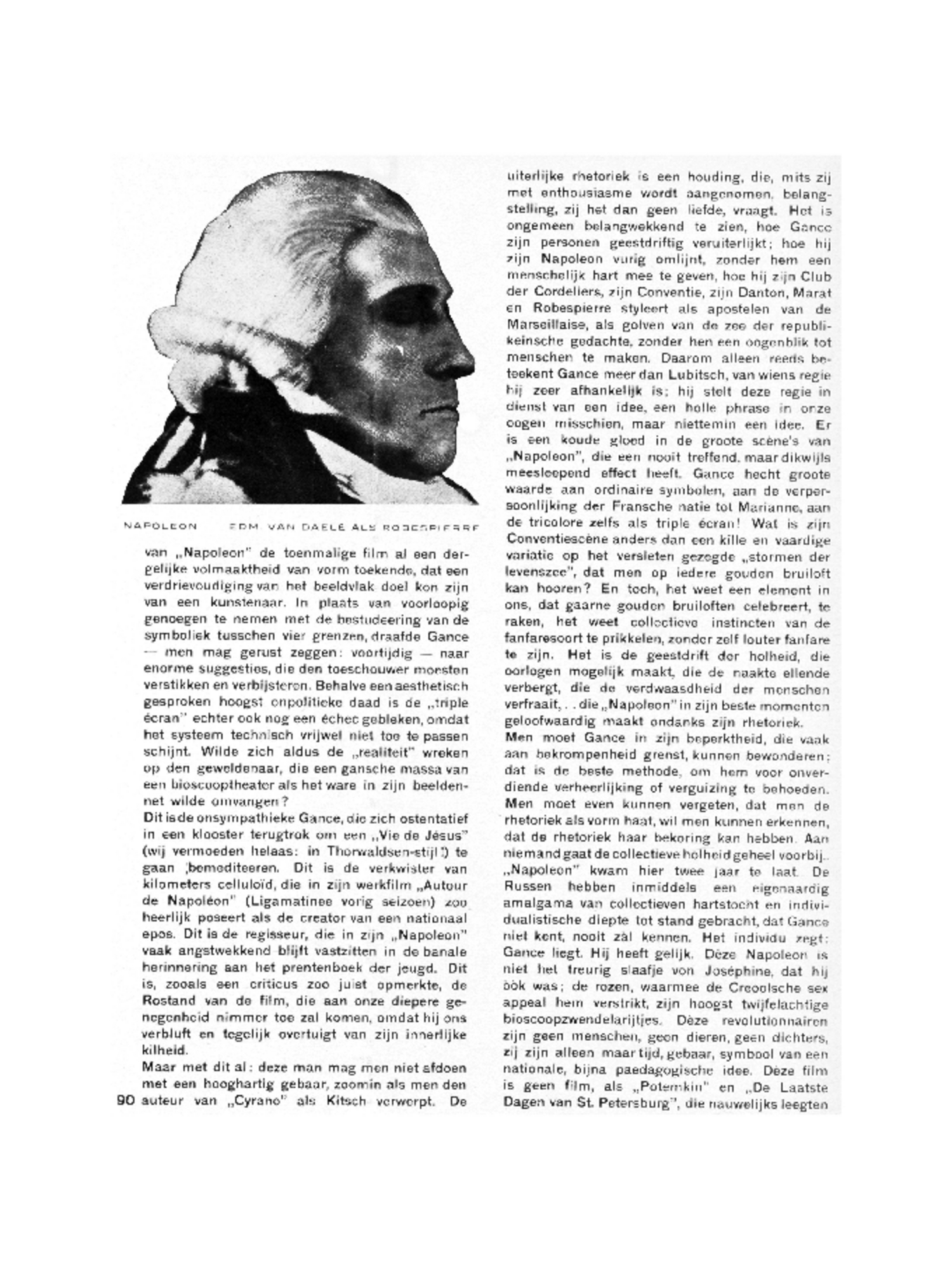 Dit is de onsympathieke Gance, die zich ostentatief in een klooster terugtrok om een ‘Vie de Jésus’ (wij vermoeden helaas: in Thorwaldsen-stijl!) te gaan bemediteeren. Dit is de verkwister van kilometers celluloïd, die in zijn werkfilm ‘Autour de Napoléon’ (Ligamatinee vorig seizoen) zoo heerlijk poseert als de creator van een nationaal epos. Dit is de regisseur, die in zijn ‘Napoleon’ vaak angstwekkend blijft vastzitten in de banale herinnering aan het prentenboek der jeugd. Dit is, zooals een criticus zoo juist opmerkte, de Rostand van de film, die aan onze diepere genegenheid nimmer toe zal komen, omdat hij ons verbluft en tegelijk overtuigt van zijn innerlijke kilheid.