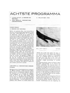Deslav, van geboorte Rus, maar woonachtig te Parijs en met de parijsche sfeer vergroeid, maakte twee films: ‘Nuits Électriques’ en ‘La Marche des Machines’, waarvan wij de laatste op dit programma brengen. In ‘Nuits Électriques’ componeert Deslav met de lichtreclames der moderne stadsnachten, elegant, maar met minder virtuositeit dan in zijn machinefilm. Hier leert men dezen jongen kunstenaar kennen als een koel en nuchter speler met filmwaarden, gansch ander machinekenner dan de romantische Dousjenko van ‘Zvenygora’. Er valt eer een verwantschap met Ivens te constateeren al geeft de bewegingsstudie ons nog geen voldoende materiaal om een definitieve vergelijking te rechtvaardigen.
