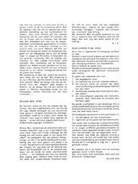 Willem Bon, student aan de amsterdamsche universiteit, beperkter nog in zijn hulpmiddelen dan Joris Ivens, maar niet minder overtuigd van het belang van zelf werken, geeft in zijn eerste film ‘Stad’ het getuigenis van een geboren filmgevoelige; en dit in de eerste plaats geeft ons aanleiding aan zijn werk gaarne een plaats in te ruimen. Na den technisch onberispelijken Dréville een cineast, die nog alles van de techniek kan leeren, die fotografisch niet in de schaduw kan staan van de eerste de beste amerikaansche prulfilm....en niettemin een man, die reeds bij deze poging geen dilettant meer blijkt te zijn! Die reeds een oorspronkelijke filmironie bezit, die treft en soms slaat, die veel materieele tekortkomingen, waarop wij den jongen filmkunstenaar betrappen, vergoedt door scherpte van ‘innerlijke’ waarneming.