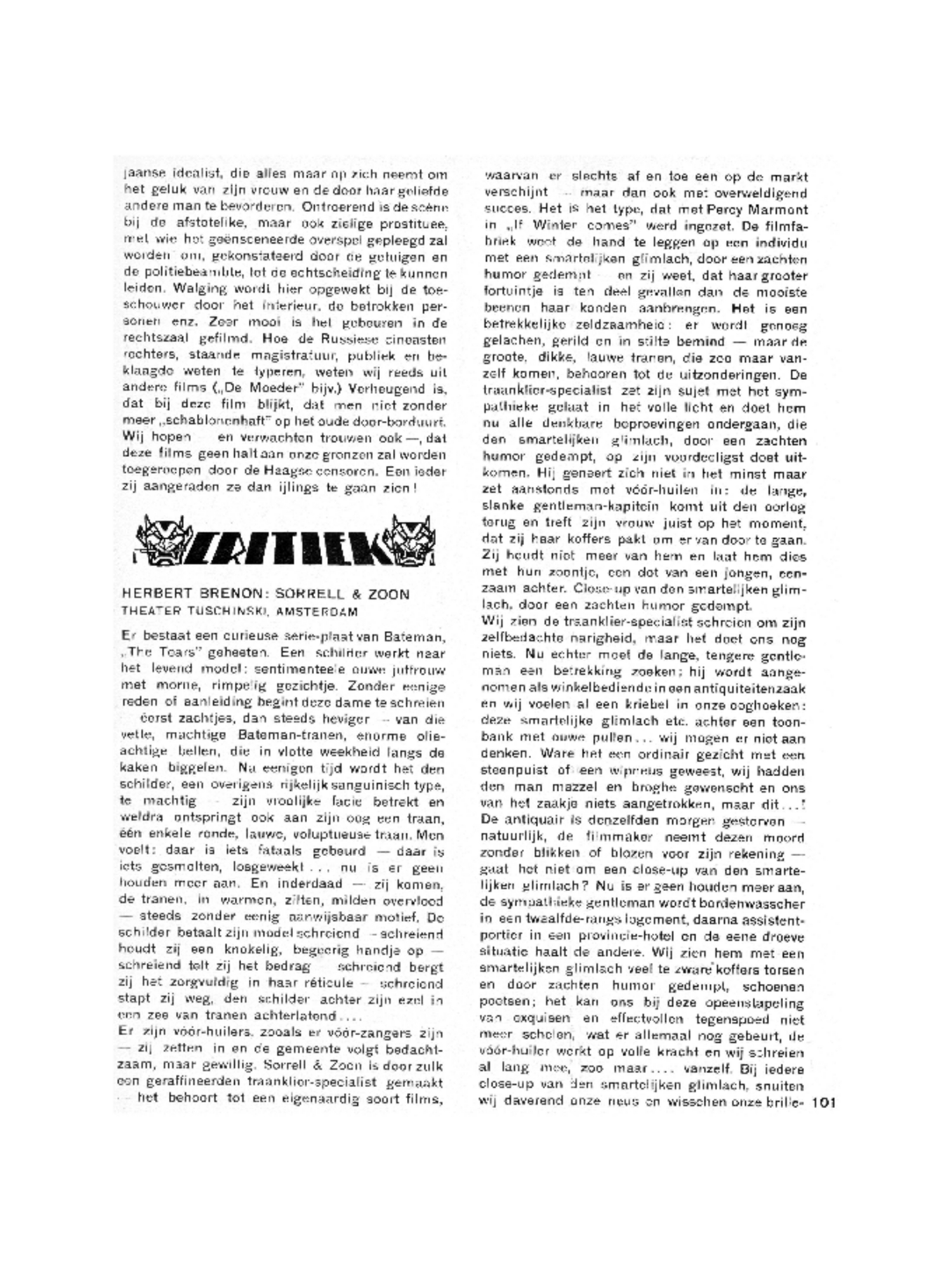 glazen af, paraat voor den volgenden tranenvloed. Het spreekt vanzelf, dat er niets werkelijk tragisch in deze film gebeurt, er zou niet gezellig genoeg bij gehuild kunnen worden. Bij de waarachtige tragiek van ‘Bett und Sofa’ denkt niemand er aan een traan te storten, het geval is te groot en te ernstig. Wij willen bij films als ‘Sorrell & Zoon’ zachtjes en aangenaam schreien, onderwijl de natuurgetrouwe opnamen van de perikelen eens nobelen gentlemans aan ons voorbij glijden en de filmmaker ons in tranen vóór gaat, schreiend zijn hand ophoudt en schreiend onze entrée in zijn réticule bergt.