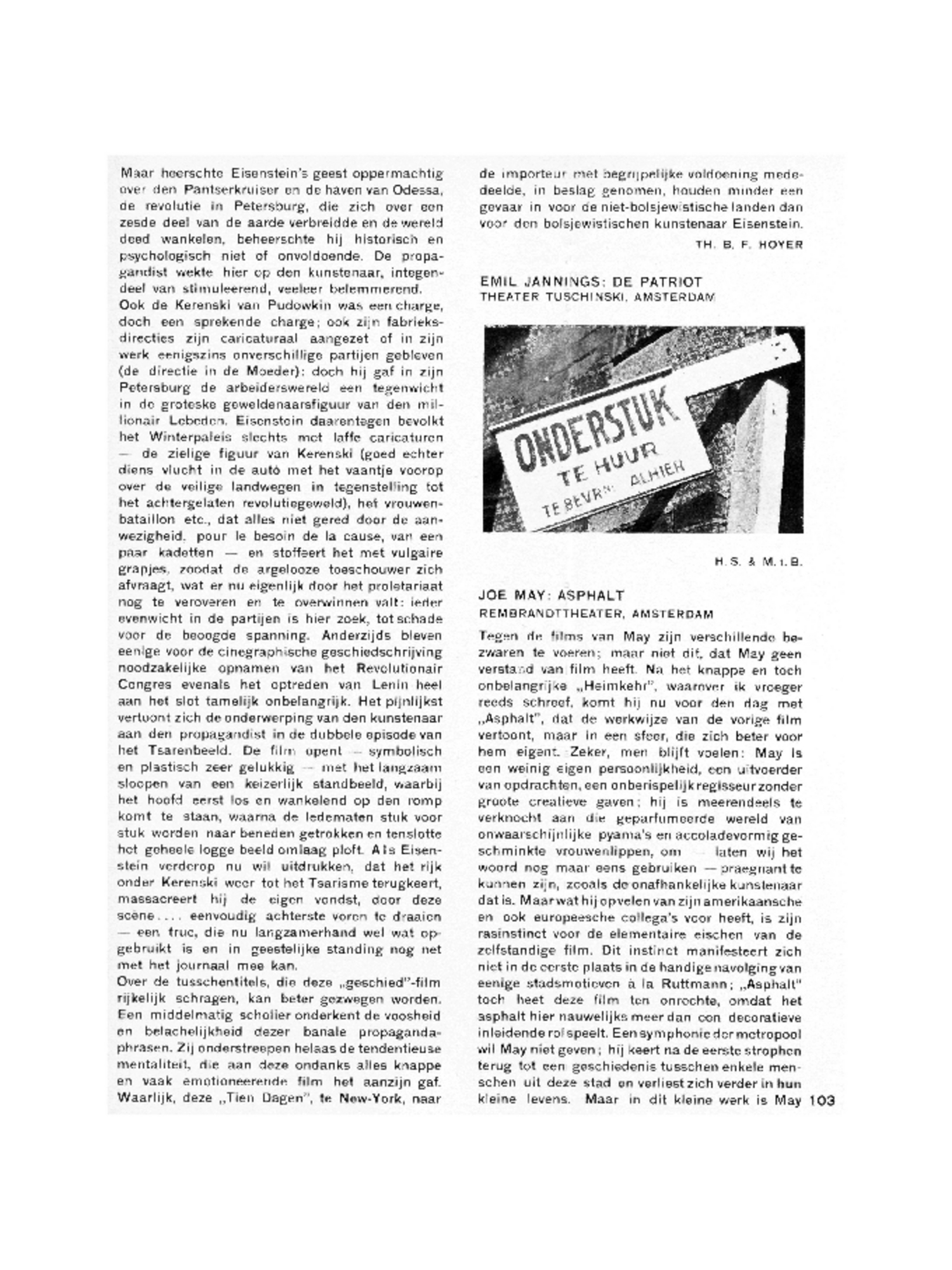 ‘Asphalt’ is, wat het gegeven betreft, een veel verbeterde editie van ‘Die Strasse’ van Karl Grüne, een film, die historisch geworden is en vrijwel ongenietbaar. May's mentaliteit doet echter meer denken aan ‘Variété’, al heeft hij te veel concessies gedaan, om Dupont's tempo te kunnen halen. Hier blijft steeds de iewat zoetelijke ondertoon storen, die in ‘Variété’ gelukkig ontbreekt. En toch: na de reeks gave misdaden op filmgebied, die wij in de laatste weken weer hebben mogen aanschouwen, mogen wij van May zeggen, dat hij althans de instrumentale zuiverheid niet heeft laten varen, dat hij, wàt hij doet, technisch volmaakt doet; zoowel fotografie als montage vormen in ‘Asphalt’ de basis, waarop gebouwd wordt.