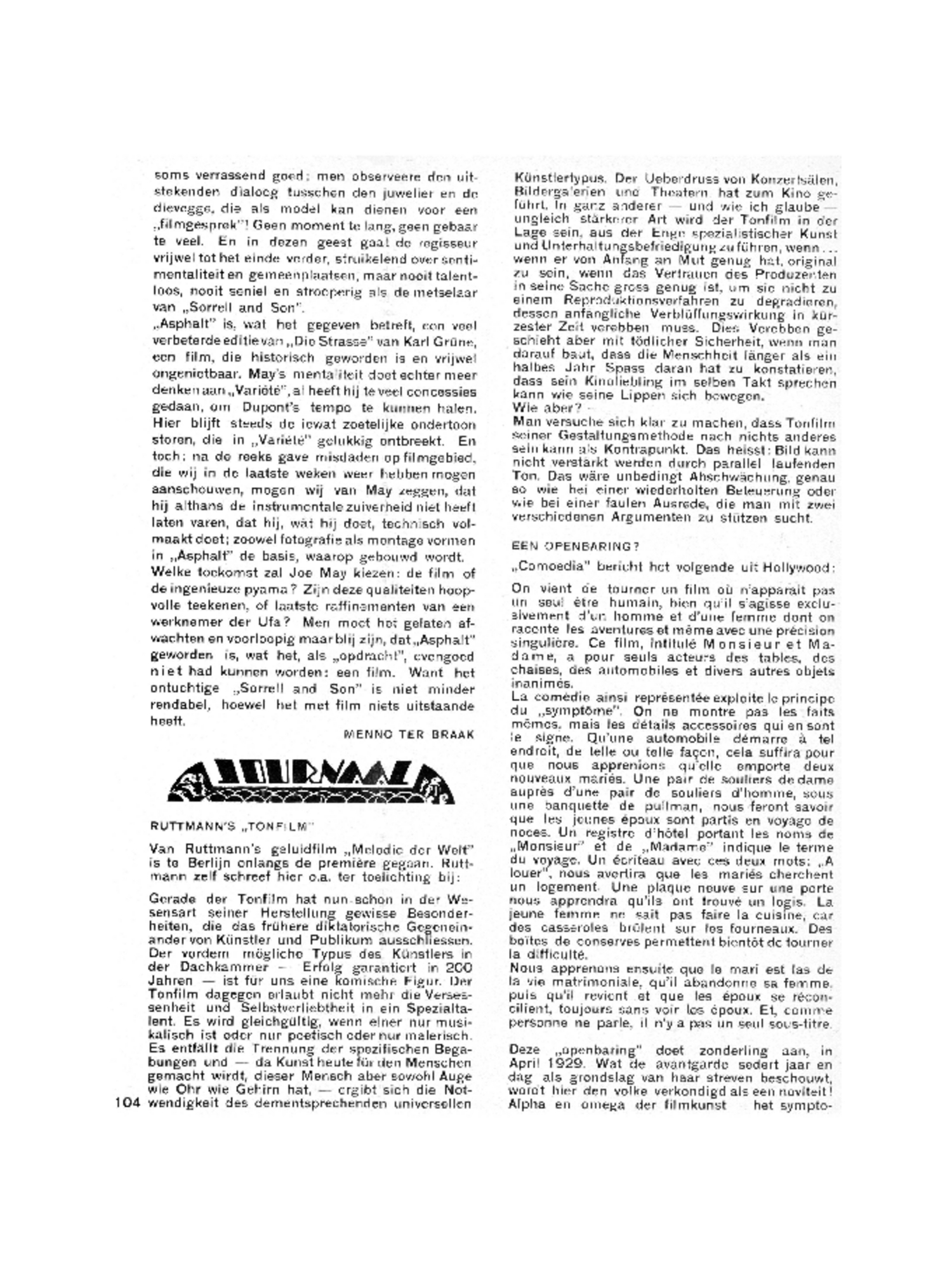Deze ‘openbaring’ doet zonderling aan, in April 1929. Wat de avantgarde sedert jaar en dag als grondslag van haar streven beschouwt, wordt hier den volke verkondigd als een noviteit! Alpha en omega der filmkunst - het sympto-