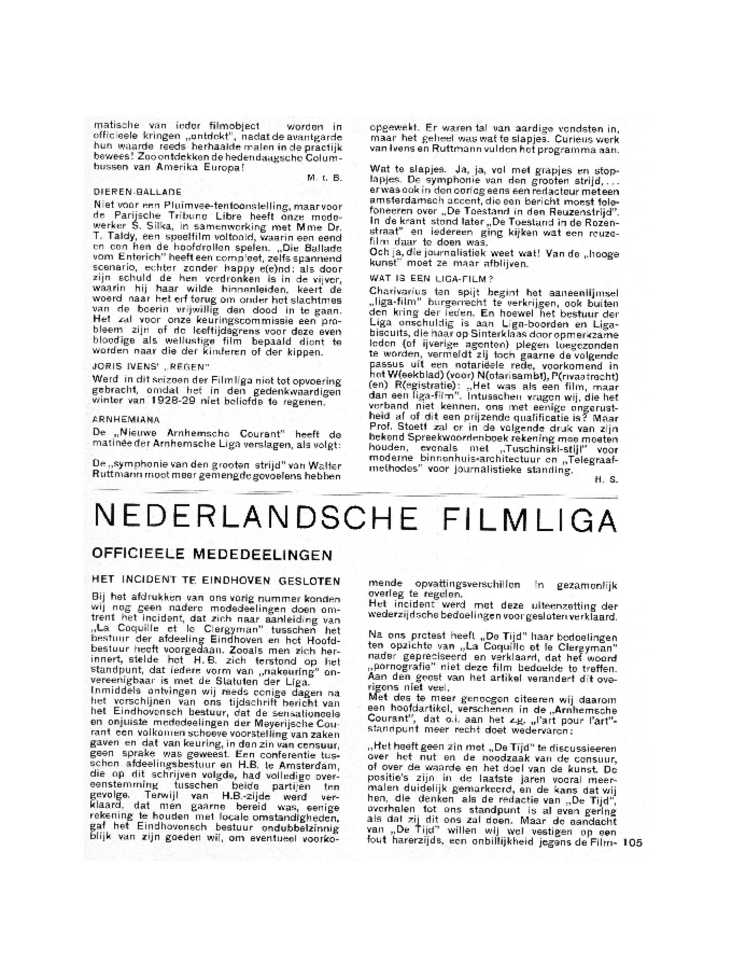 Charivarius ten spijt begint het aaneenlijmsel ‘liga-film’ burgerrecht te verkrijgen, ook buiten den kring der leden. En hoewel het bestuur der Liga onschuldig is aan Liga-boorden en Ligabiscuits, die haar op Sinterklaas door opmerkzame leden (of ijverige agenten) plegen toegezonden te worden, vermeldt zij toch gaarne de volgende passus uit een notariëele rede, voorkomend in het W(eekblad) (voor) N(otarisambt), P(rivaatrecht) (en) R(egistratie): ‘Het was als een film, maar dan een liga-film’. Intusschen vragen wij, die het verband niet kennen, ons met eenige ongerustheid af of dit een prijzende qualificatie is? Maar Prof. Stoett zal er in de volgende druk van zijn bekend Spreekwoordenboek rekening mee moeten houden, evenals met ‘Tuschinski-stijl’ voor moderne binnenhuis-architectuur en ‘Telegraafmethodes’ voor journalistieke standing.
