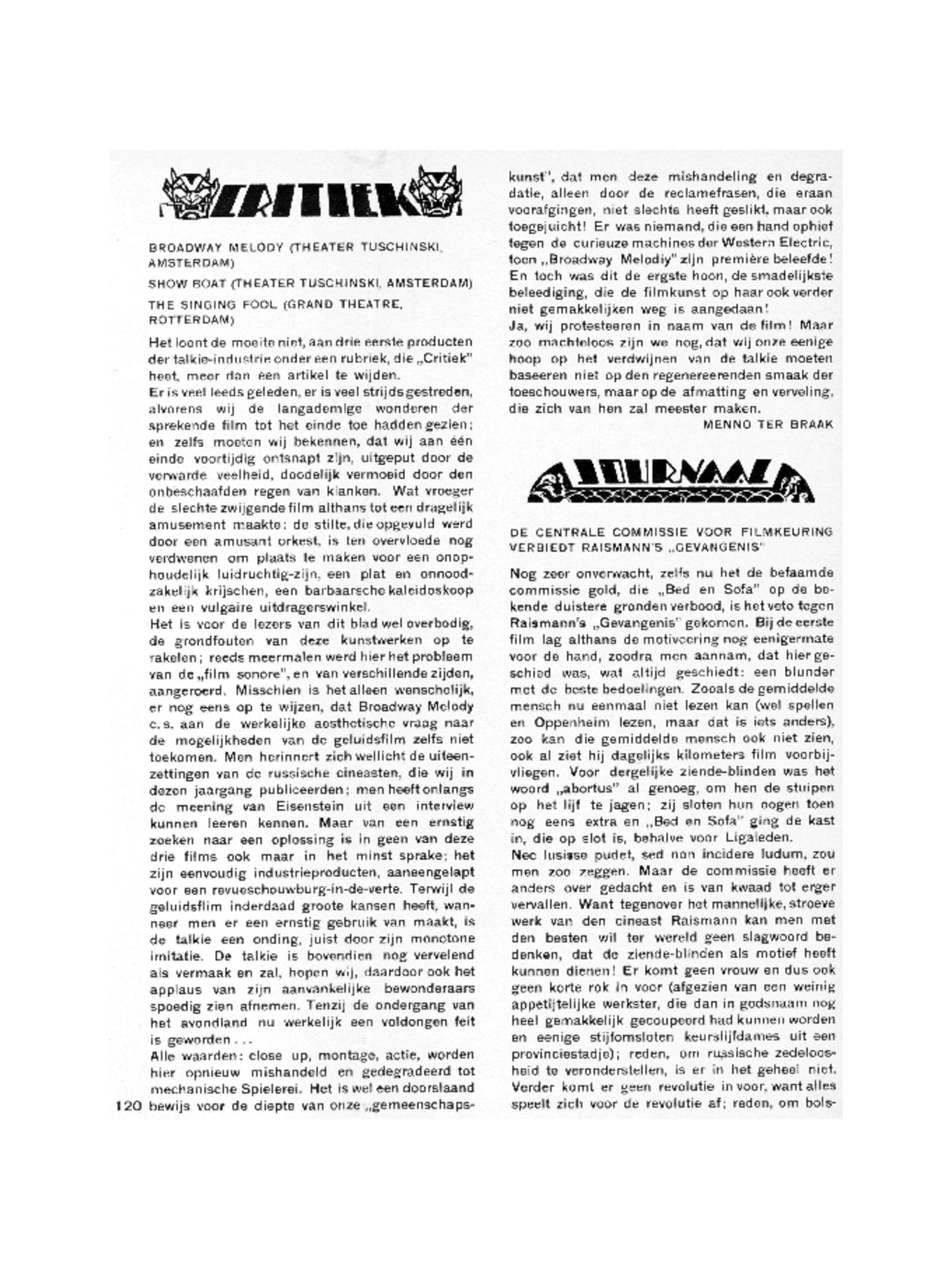 Nog zeer onverwacht, zelfs nu het de befaamde commissie gold, die ‘Bed en Sofa’ op de bekende duistere gronden verbood, is het veto tegen Raismann's ‘Gevangenis’ gekomen. Bij de eerste film lag althans de motiveering nog eenigermate voor de hand, zoodra men aannam, dat hier geschied was, wat altijd geschiedt: een blunder met de beste bedoelingen. Zooals de gemiddelde mensch nu eenmaal niet lezen kan (wel spellen en Oppenheim lezen, maar dat is iets anders), zoo kan die gemiddelde mensch ook niet zien, ook al ziet hij dagelijks kilometers film voorbijvliegen. Voor dergelijke ziende-blinden was het woord ‘abortus’ al genoeg, om hen de stuipen op het lijf te jagen; zij sloten hun oogen toen nog eens extra en ‘Bed en Sofa’ ging de kast in, die op slot is, behalve voor Ligaleden.