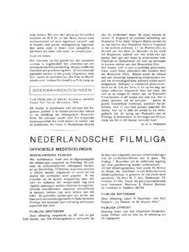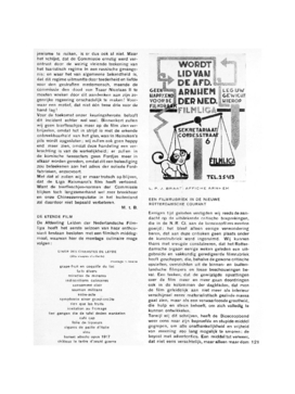 Eenigen tijd geleden vestigden wij reeds de aandacht op de uitstekende critische besprekingen, die in de N.R. Ct. aan de bioscoopfilms werden gewijd; het bleef alleen eenige verwondering baren, dat aan deze critieken geen plaats onder de kunstrubriek werd ingeruimd. Wij kunnen thans met vreugde constateeren, dat het Rotterdamsche orgaan eenige weken geleden een uitgebreide en vakkundig geredigeerde filmrubriek heeft geschapen, die, behalve de gewone critische opstellen, overzichten uit de binnen- en buitenlandsche filmpers en losse beschouwingen bevat. Een teeken, dat de gewijzigde opvattingen over de film meer en meer gaan doordringen ook in de kolommen der dagbladen, dat men de film geleidelijk aan niet meer als inferieur verschijnsel eener materialistisch gezinde massa gaat zien, maar als een verwaarloosde grootheid, die hulp en steun behoeft, om zich volledig te kunnen ontwikkelen.