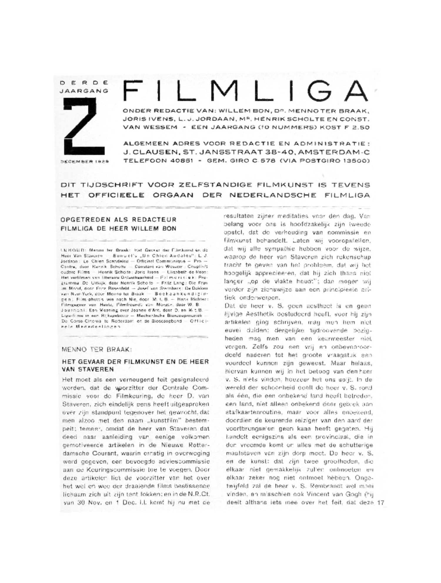 Het moet als een verheugend feit gesignaleerd worden, dat de voorzitter der Centrale Commissie voor de Filmkeuring, de heer D. van Staveren, zich eindelijk eens heeft uitgesproken over zijn standpunt tegenover het gewrocht, dat men alzoo met den naam ‘kunstfilm’ bestempelt; temeer, omdat de heer van Staveren dat deed naar aanleiding van eenige volkomen gemotiveerde artikelen in de Nieuwe Rotterdamsche Courant, waarin ernstig in overweging werd gegeven, een bevoegde adviescommissie aan oe Keuringscommissie toe te voegen. Door deze artikelen liet de voorzitter van het over het wel en wee der draaiende films beslissende lichaam zich uit zijn tent lokken; en in de N.R.Ct. van 30 Nov. en 1 Dec. I.I. komt hij nu met de resultaten zijner meditaties voor den dag. Van belang voor ons is hoofdzakelijk zijn tweede opstel, dat de verhouding van commissie en filmkunst behandelt. Laten wij vooropsteilen, dat wij alle sympathie hebben voor de wijze, waarop de heer van Staveren zich rekenschap tracht te geven van het probleem, dat wij het hoogelijk apprecieeren, dat hij zich thans niet langer ‘op de vlakte houdt’; dan mogen wij verder zijn zienswijze aan een principieele critiek onderwerpen.
