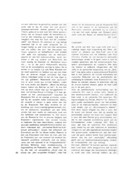 en een volkomen leugenachtig verhaal van datgene wat er bij de ramp van een grooten passagiersstoomer steeds gebeurt en bij de Titanic gebeurd is (om over het kleine gemeenheidje dat de lafaard onder de bemanning natuurlijk een kleurling zijn moest, nog maar te zwijgen) dan was het toch wel dit ‘meesterwerk’ van Dupont. En wanneer er nog eenige waarheid ligt in de oude uitspraak dat de leugen leelijk is, wat moet men dan wel denken van die critici, die door het blanketsel van fraaie opnamen en lichteffecten niet konden zien welk een caricatuur van de matrozenpsyche en van het matrozen-milieu werd vertoond in die z.g. dokken van New-York, die even weinig op Hoboken en Manhattan leken als...nu ja, als zoo'n Hollywood's decortje ooit op de werkelijkheid vermag te lijken. Nu is echter in de laatste tijd ook Miss Rusland aan de beurt gekomen en hebben wij van den Heer Bon en anderen mogen vernemen dat haar enkels inderdaad soms te dun en haar dijen te dik zijn gebleken. Waarmede men opzichzelf ook al weer vrede zou kunnen hebben, onder het oude motto van Goethe: ‘Wenn die Könige bauen, haben die Kärrner zu tun’. Ik zou dan ook op deze critiek niet zijn teruggekomen indien niet de Heer Boost in Filmliga III, 4 had gewezen op het ‘wezensverschil’ tusschen de Russische film en de overige productie, zonder dat hij dit verschil nader preciseerde. Welnu, dit verschil in wezen is geen ander dan dat bij de Russische film idee, tendens en uitdrukking een onverbrekelijk geheel vormen, zooals de abstractie: bovenkant van een tafel, zonder het zeer reeële en materieele hout van het tafelblad niet bestaanbaar is. Het wezen van de Russische film is precies datgene wat Eisenstein signaleerde: haar sociale functie, en iedereen die haar desondanks, volgens een asociale aesthetica wenscht te beoordeelen, verdient inderdaad dat: ‘ich meinen Stuhl ins Auditorium schleudere’, zooals het antwoord van Eisenstein aan Dr. ter Braak luidde. Daarom is dan ook Eisenstein niet meer de man ‘die hier (in Potemkin) een van moment tot moment beheerscht proefstuk volbracht, met de beteekenis van een episode in de filmgeschiedenis’ (Cinéma Militans), maar doodeenvoudig, in tegenstelling tot Pudowkin, een ‘Bauer’. Doch hij, die niet, vol verwachting, uitziet naar de komst van ‘den volgenden halfgod’, maar het wezen en de beteekenis van de Russische film ziet in het wezen en de beteekenis van de Russische revolutie, glimlacht bij de herinnering aan het oude rijmpje van Rückert: ‘denn wäre nicht der Bauer, so hättest Du kein Brot!’
