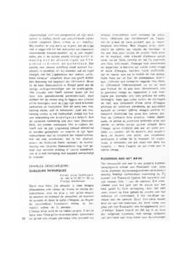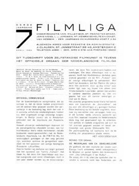 uitgenoodigd, zelf een programma uit zijn werk samen te stellen, heeft van verschillende zijden critiek uitgelokt. Deze critiek is o.i. onbillijk. Wij moeten er nog eens op wijzen, dat de Liga niet is opgericht tot het vertoonen van algemeen bewonderde meesterwerken; zij is een organisatie, die in de eerste plaats beoogt kennismaking met de stroomingen op filmgebied in binnen- en buitenland. Dat daarbij een zekere schifting moet worden toegepast, is duidelijk; en wij meenen, dat de regel bewijst, dat het Ligabestuur een zekere ‘artistieke censuur’ uitoefent. Voor ons geeft echter den doorslag het beginsel der informatie. Waar nu de heer Dekeukeleire in België geldt als de eenige vertegenwoordiger van de avant-garde-film (zooals men heeft kunnen lezen uit het door ons gepubliceerde persmateriaal), daar scheen het op onzen weg te liggen, den cineast uit te noodigen, voor de Liga zijn werk te komen vertoonen en toelichten. Dat dit werk een mislukking bleek, valt te betreuren; juist als mislukking echter is het instructief, omdat het hier een mislukking der avantgarde betreft. Aan de oprechte bedoeling van den heer Dekeukeleire, om zonder concessie film te maken, behoeft ook na zijn ongelukkig debuut allerminst te worden getwijfeld; en daarom is zijn falen instructiever dan de leegheid der industrie films. Het wil ons voorkomen, dat in het stadium, waarin de filmkunst thans verkeert, de kennismaking met Charles Dekeukeleire nog niet geheel een verloren middag of avond beteekent, ook al is een herhaling niet bepaald wenschelijk te noemen.