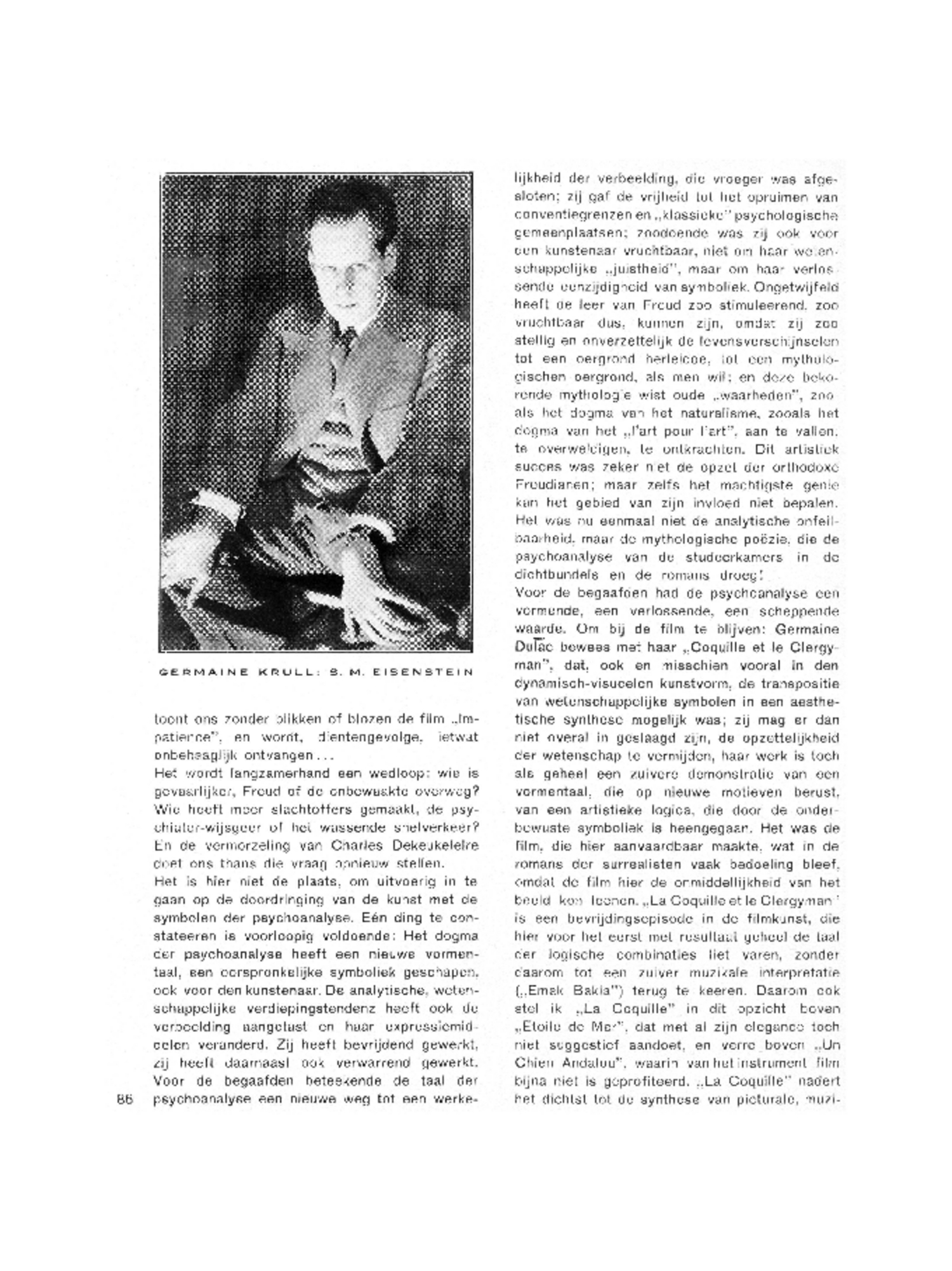 Voor de begaafden had de psychoanalyse een vormende, een verlossende, een scheppende waarde. Om bij de film te blijven: Germaine Dulac bewees met haar ‘Coquille et le Clergyman’, dat, ook en misschien vooral in den dynamisch-visueelen kunstvorm, de transpositie van wetenschappelijke symbolen in een aesthetische synthese mogelijk was; zij mag er dan niet overal in geslaagd zijn, de opzettelijkheid der wetenschap te vermijden, haar werk is toch als geheel een zuivere demonstratie van een vormentaal, die op nieuwe motieven berust, van een artistieke logica, die door de onderbewuste symboliek is heengegaan. Het was de film, die hier aanvaardbaar maakte, wat in de romans der surrealisten vaak bedoeling bleef, omdat de film hier de onmiddellijkheid van het beeld kon leenen. ‘La Coquille et le Clergyman’ is een bevrijdingsepisode in de filmkunst, die hier voor het eerst met resultaat geheel de taal der logische combinaties liet varen, zonder daarom tot een zuiver muzikale interpretatie (‘Emak Bakia’) terug te keeren. Daarom ook stel ik ‘La Coquille’ in dit opzicht boven ‘Etoile de Mer’, dat met al zijn elegance toch niet suggestief aandoet, en verre boven ‘Un Chien Andalou’, waarin van het instrument film bijna niet is geprofiteerd. ‘La Coquille’ nadert het dichtst tot de synthese van picturale, muzi-