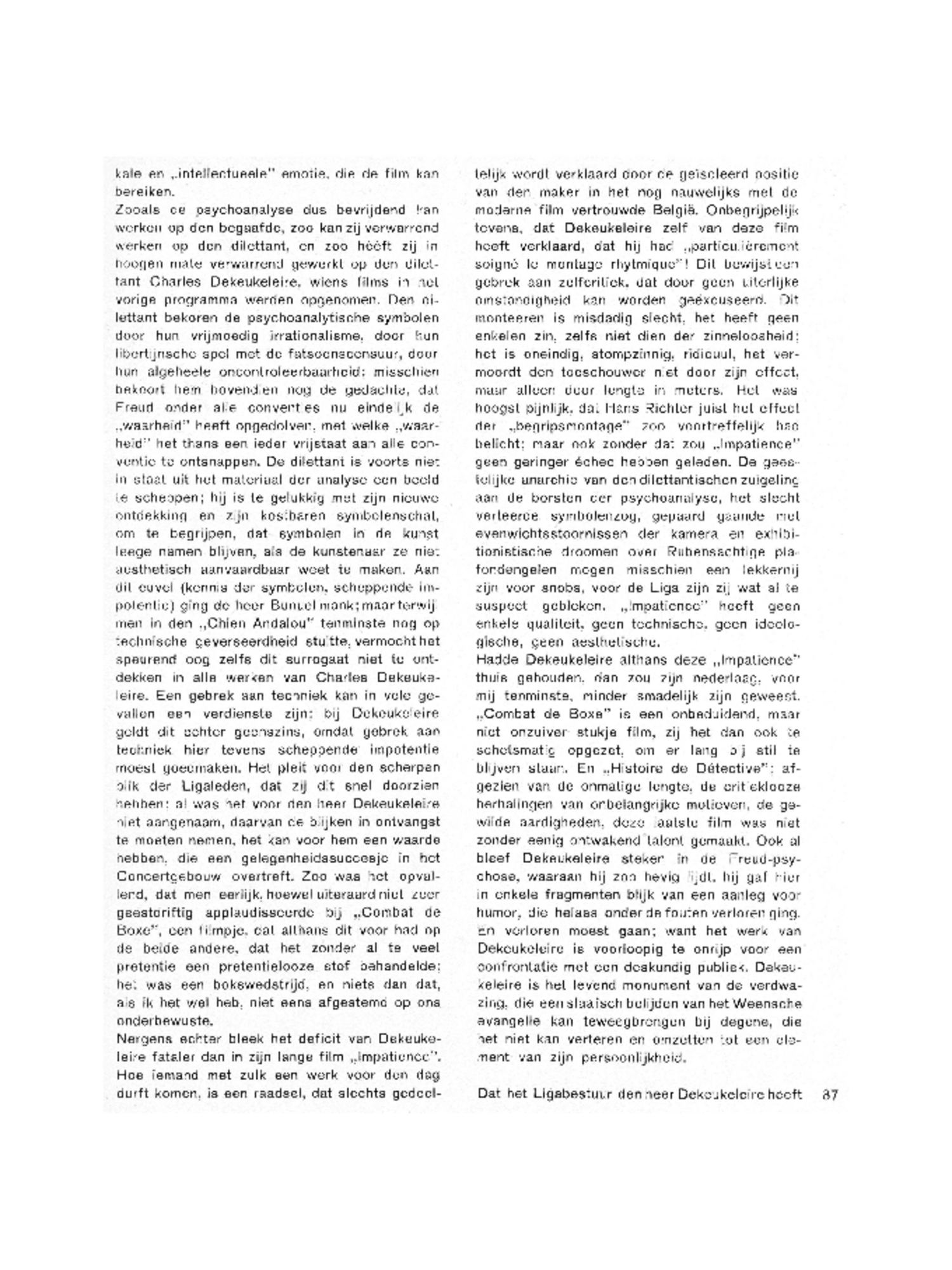 Nergens echter bleek het deficit van Dekeukeleire fataler dan in zijn lange film ‘Impatience’. Hoe iemand met zulk een werk voor den dag durft komen, is een raadsel, dat slechts gedeeltelijk wordt verklaard door de geïsoleerd positie van den maker in het nog nauwelijks met de moderne film vertrouwde België. Onbegrijpelijk tevens, dat Dekeukeleire zelf van deze film heeft verklaard, dat hij had ‘particulièrement soigné le montage rhytmique’! Dit bewijst een gebrek aan zelfcritiek, dat door geen uiterlijke omstandigheid kan worden geëxcuseerd. Dit monteeren is misdadig slecht, het heeft geen enkelen zin, zelfs niet dien der zinneloosheid; het is oneindig, stompzinnig, ridicuul, het vermoordt den toeschouwer niet door zijn effect, maar alleen door lengte in meters. Het was hoogst pijnlijk, dat Hans Richter juist het effect der ‘begripsmontage’ zoo voortreffelijk had belicht; maar ook zonder dat zou ‘Impatience’ geen geringer échec hebben geleden. De geestelijke anarchie van den dilettantischen zuigeling aan de borsten der psychoanalyse, het slecht verteerde symbolenzog, gepaard gaande met evenwichtsstoornissen der kamera en exhibitionistische droomen over Rubensachtige plafondengelen mogen misschien een lekkernij zijn voor snobs, voor de Liga zijn zij wat al te suspect gebleken. ‘Impatience’ heeft geen enkele qualiteit, geen technische, geen ideologische, geen aesthetische.