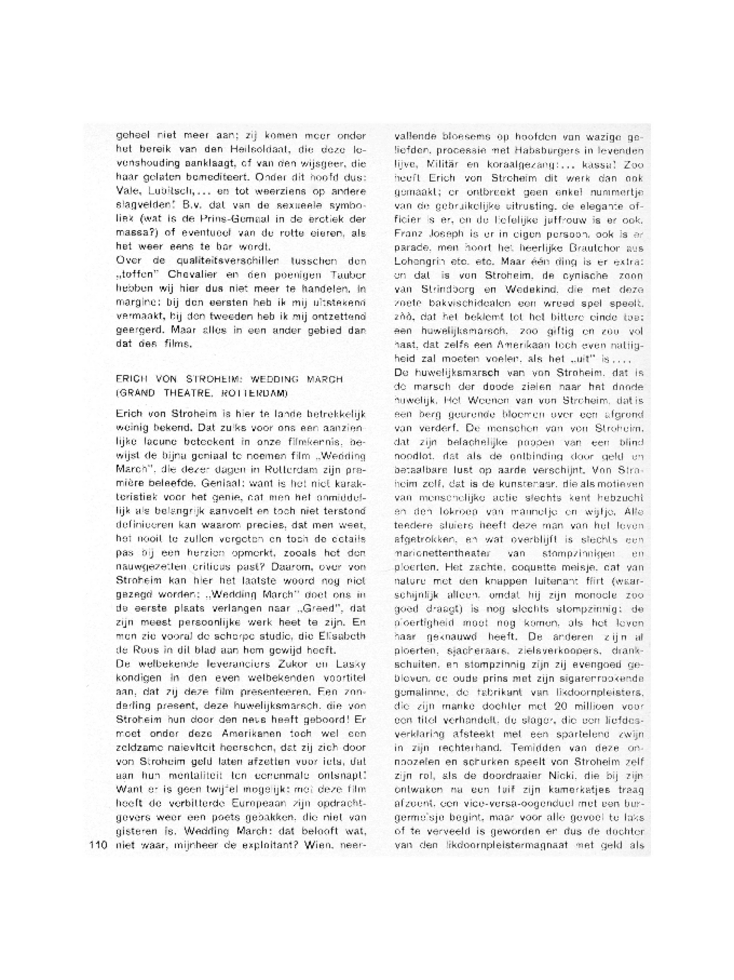 De welbekende leveranciers Zukor en Lasky kondigen in den even welbekenden voortitel aan, dat zij deze film presenteeren. Een zonderling present, deze huwelijksmarsch, die von Stroheim hun door den neus heeft geboord! Er moet onder deze Amerikanen toch wel een zeldzame naieviteit heerschen, dat zij zich door von Stroheim geld laten afzetten voor iets, dat aan hun mentaliteit ten eenenmale ontsnapt! Want er is geen twijfel mogelijk; met deze film heeft de verbitterde Europeaan zijn opdrachtgevers weer een poets gebakken, die niet van gisteren is. Wedding March: dat belooft wat, niet waar, mijnheer de exploitant? Wien, neervallende bloesems op hoofden van wazige geliefden, processie met Habsburgers in levenden lijve, Militär en koraalgezang:...kassa! Zoo heeft Erich von Stroheim dit werk dan ook gemaakt; er ontbreekt geen enkel nummertje van de gebruikelijke uitrusting, de elegante officier is er, en de liefelijke juffrouw is er ook, Franz Joseph is er in eigen persoon, ook is er parade, men hoort het heerlijke Brautchor aus Lohengrin etc. etc. Maar één ding is er extra: en dat is von Stroheim, de cynische zoon van Strindberg en Wedekind, die met deze zoete bakvischidealen een wreed spel speelt, zòò, dat het beklemt tot het bittere einde toe; een huwelijksmarsch, zoo giftig en zoo vol haat, dat zelfs een Amerikaan toch even nattigheid zal moeten voelen, als het ‘uit’ is....