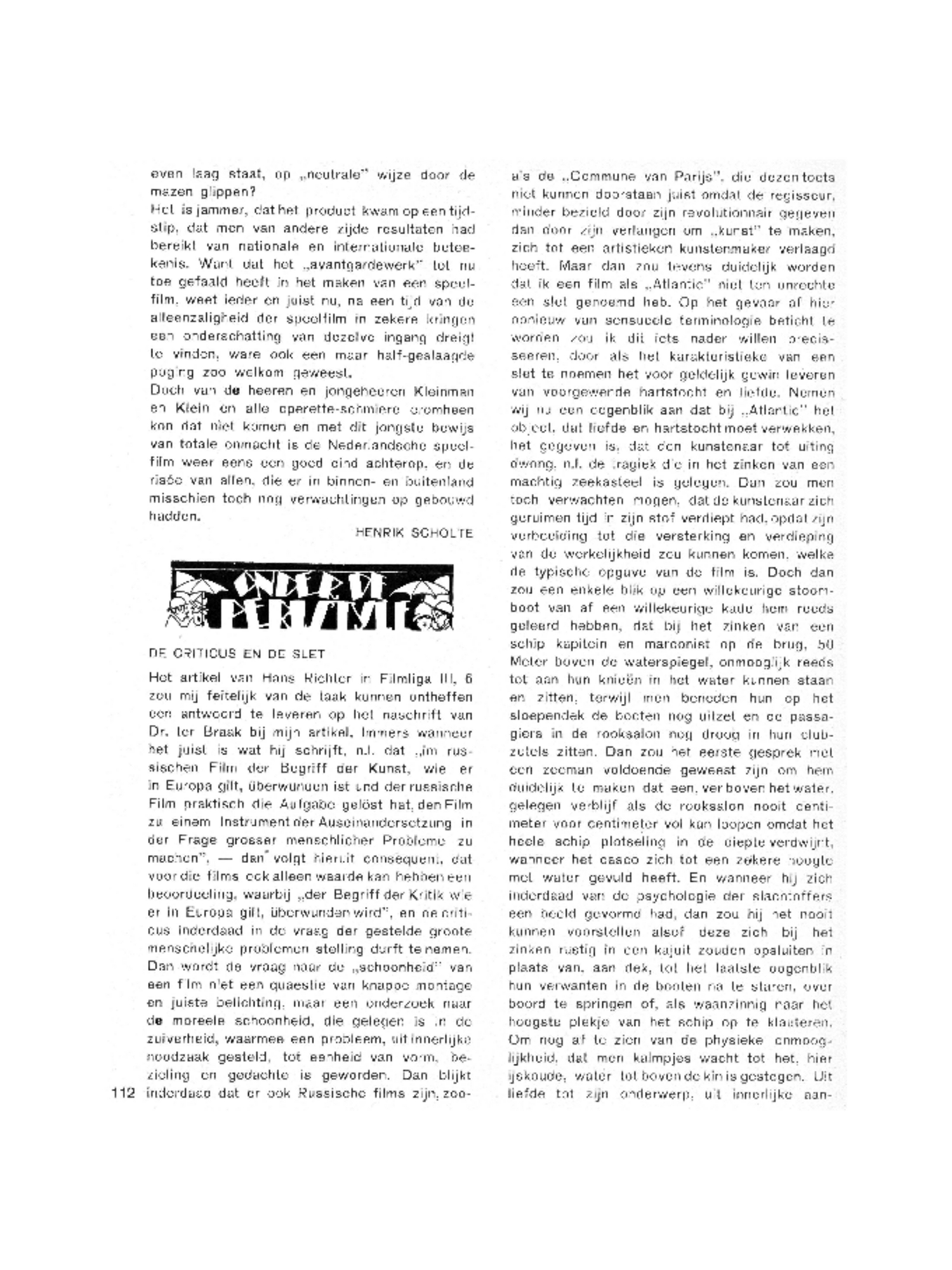 Het is jammer, dat het product kwam op een tijdstip, dat men van andere zijde resultaten had bereikt van nationale en internationale beteekenis. Want dat het ‘avantgardewerk’ tot nu toe gefaald heeft in het maken van een speelfilm, weet ieder en juist nu, na een tijd van de alleenzaligheid der speelfilm in zekere kringen een onderschatting van dezelve ingang dreigt te vinden, ware ook een maar half-geslaagde poging zoo welkom geweest.