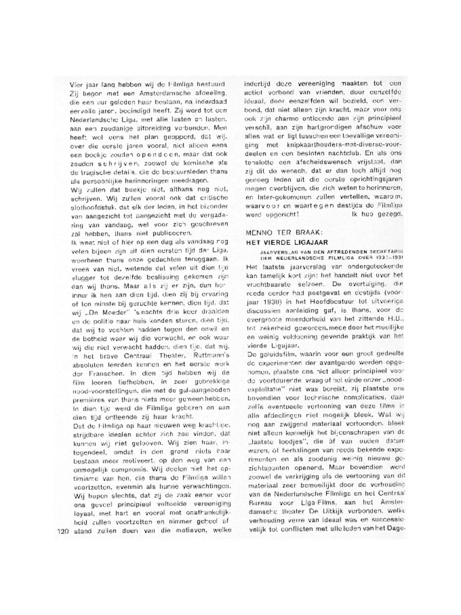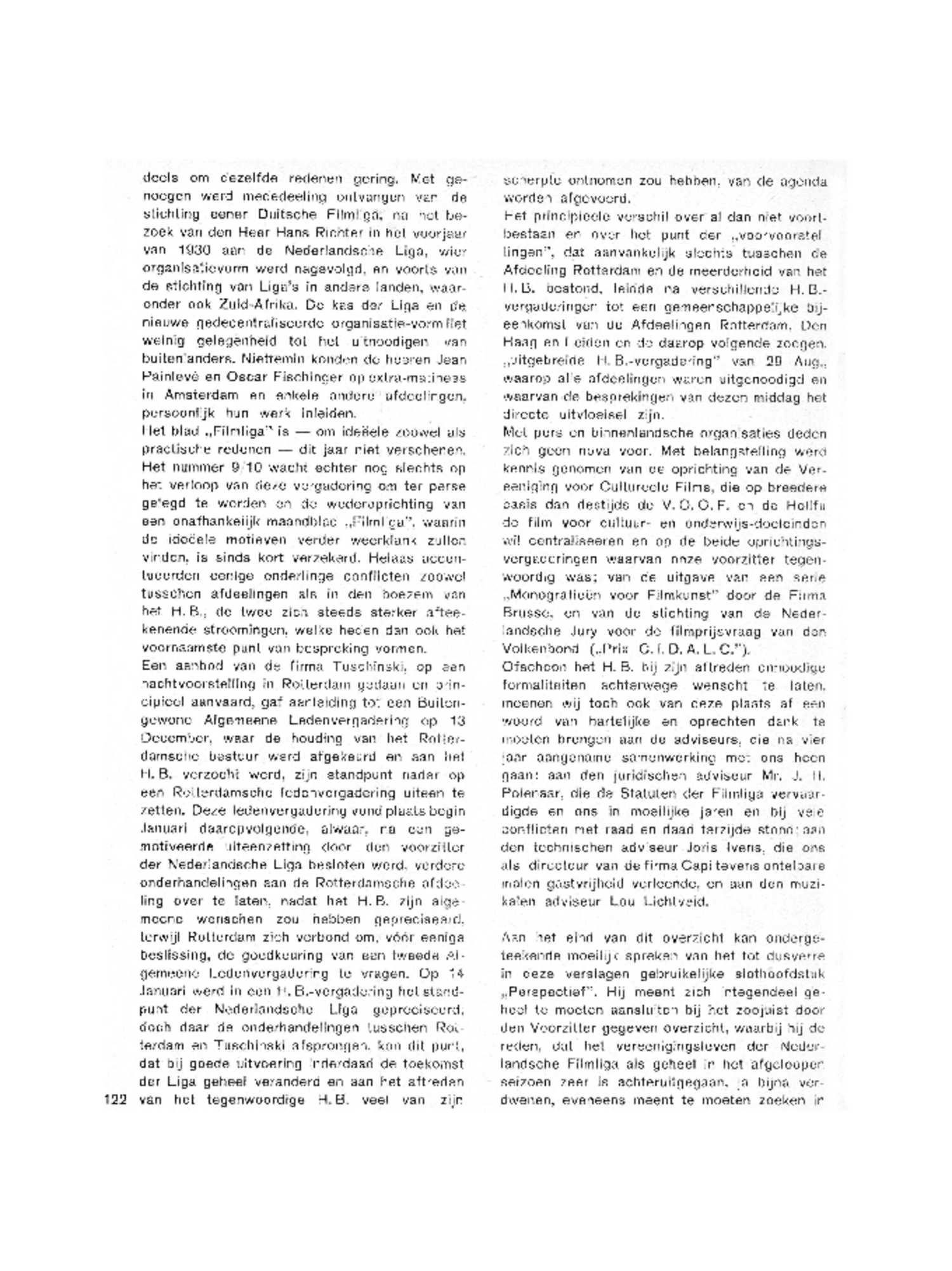Het blad ‘Filmliga’ is - om ideëele zoowel als practische redenen - dit jaar niet verschenen. Het nummer 9/10 wacht echter nog slechts op het verloop van deze vergadering om ter perse gelegd te worden en de wederoprichting van een onafhankelijk maandblad ‘Filmliga’, waarin de ideëele motieven verder weerklank zullen vinden, is sinds kort verzekerd. Helaas accentueerden eenige onderlinge conflicten zoowel tusschen afdeelingen als in den boezem van het H.B., de twee zich steeds sterker afteekenende stroomingen, welke heden dan ook het voornaamste punt van bespreking vormen.