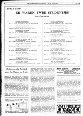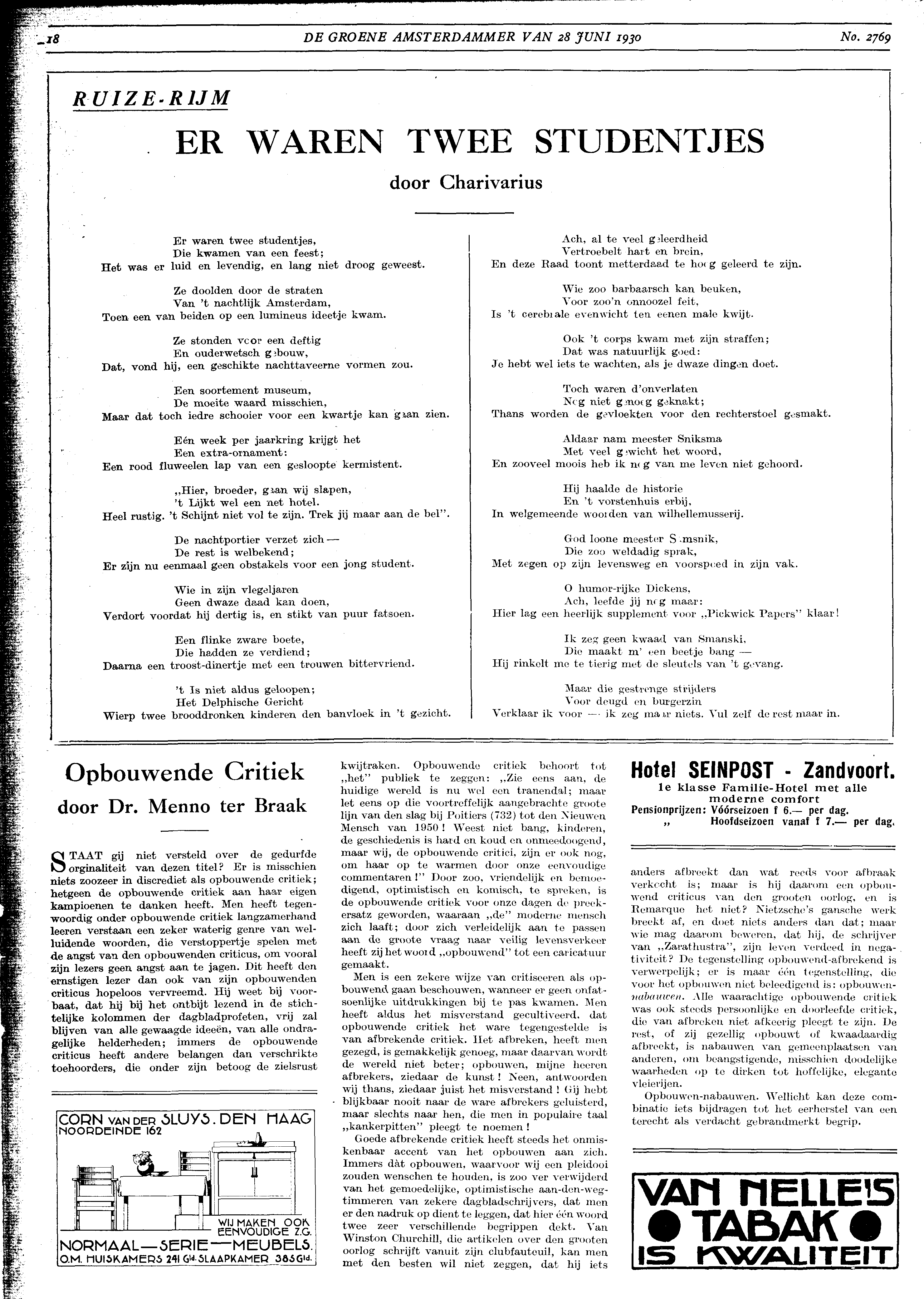STAAT gij niet versteld over de gedurfde orginaliteit van dezen titel? Er is misschien niets zoozeer in discrediet als opbouwende critiek; hetgeen de opbouwende critiek aan haar eigen kampioenen te danken heeft. Men heeft tegenwoordig onder opbouwende critiek langzamerhand leeren verstaan een zeker waterig genre van welluidende woorden, die verstoppertje spelen met de angst van den opbouwenden criticus, om vooral zijn lezers geen angst aan te jagen. Dit heeft den ernstigen lezer dan ook van zijn opbouwenden criticus hopeloos vervreemd. Hij weet bij voorbaat, dat hij bij het ontbijt lezend in de stichtelijke kolommen der dagbladprofeten, vrij zal blijven van alle gewaagde ideeën, van alle ondraagelijke helderheden; immers de opbouwende criticus heeft andere belangen dan verschrikte toehoorders, die onder zijn betoog de zielsrust kwijtraken. Opbouwende critiek behoort tot ‘het’ publiek te zeggen: ‘Zie eens aan, de huidige wereld is nu wel een tranendal; maar let eens op die voortreffelijk aangebrachte groote lijn van den slag bij Poitiers (732) tot den Nieuwen Mensch van 1950! Weest niet bang, kinderen, de geschiedenis is hard en koud en onmeedoogend, maar wij, de opbouwende critici, zijn er ook nog, om haar op te warmen door onze eenvoudige commentaren!’ Door zoo, vriendelijk en bemoedigend, optimistisch en komisch, te spreken, is de opbouwende critiek voor onze dagen de preek-ersatz geworden, waaraan ‘‘de’’ moderne mensch zich laaft; door zich verleidelijk aan te passen aan de groote vraag naar veilig levensverkeer heeft zij het woord ‘opbouwend’ tot een caricatuur gemaakt.
