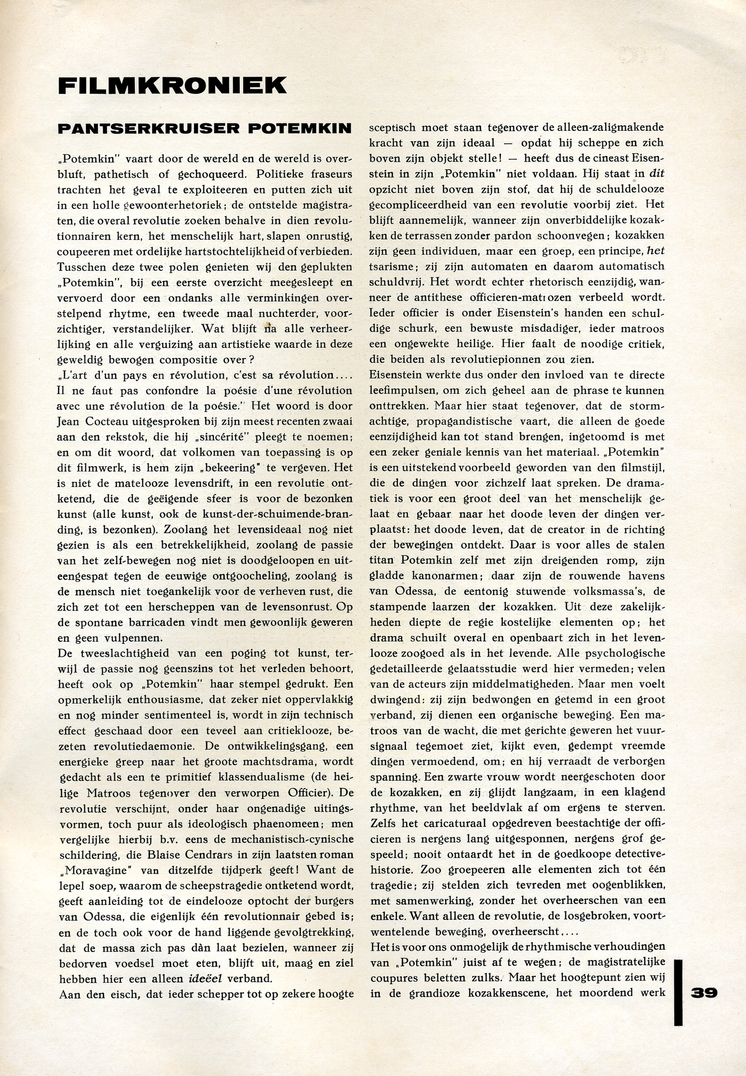 ‘Potemkin’ vaart door de wereld en de wereld is overbluft, pathetisch of gechoqueerd. Politieke fraseurs trachten het geval te exploiteeren en putten zich uit in een holle gewoonterhetoriek; de ontstelde magistraten, die overal revolutie zoeken behalve in dien revolutionnairen kern, het menschelijk hart, slapen onrustig, coupeeren met ordelijke hartstochtelijkheid of verbieden. Tusschen deze twee polen genieten wij den geplukten ‘Potemkin’, bij een eerste overzicht meegesleept en vervoerd door een ondanks alle verminkingen overstelpend rhytme, een tweede maal nuchterder, voorzichtiger, verstandelijker. Wat blijft na alle verheerlijking en alle verguizing aan artistieke waarde in deze geweldig bewogen compositie over?