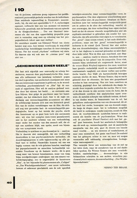 Het laat zich eigenlijk zeer eenvoudig en scherp formuleeren, waarom deze psychoanalytische film, waaraan alle raffinement van jarenlang technisch pogen ten deel is gevallen, van aesthetisch standpunt niet meer dan een interessant experiment is gebleven; in de woordverbinding ‘psychoanalytisch’ en ‘film’ ligt de oorzaak al opgesloten. Hier wil de analyse gediend worden door het vizioen, het beeld....en niettemin analyse blijven; hier grijpt de psychiater naar het kunstmiddel, óm het didactisch doel; hier is de regie onderdanig aan wetenschappelijke accuratesse en offert de willekeurige fantasie zich aan een historisch geval. Eén van de oudste vertakkingen van de film, die zichzelf nog niet gevonden had: de wetenschappelijk-paedagogische, komt op het terrein der psyche, eischt den kunstenaar op en gunt hem toch zijn autonomie niet; wij zien het complex (mes-vrees) geanalyseerd, niet in het nuchtere schema van een verhandeling, maar onder het masker van den mensch zelf, die altijd een synthese blijft, een speler, nooit een bijeenzijn van symptomen wordt.
