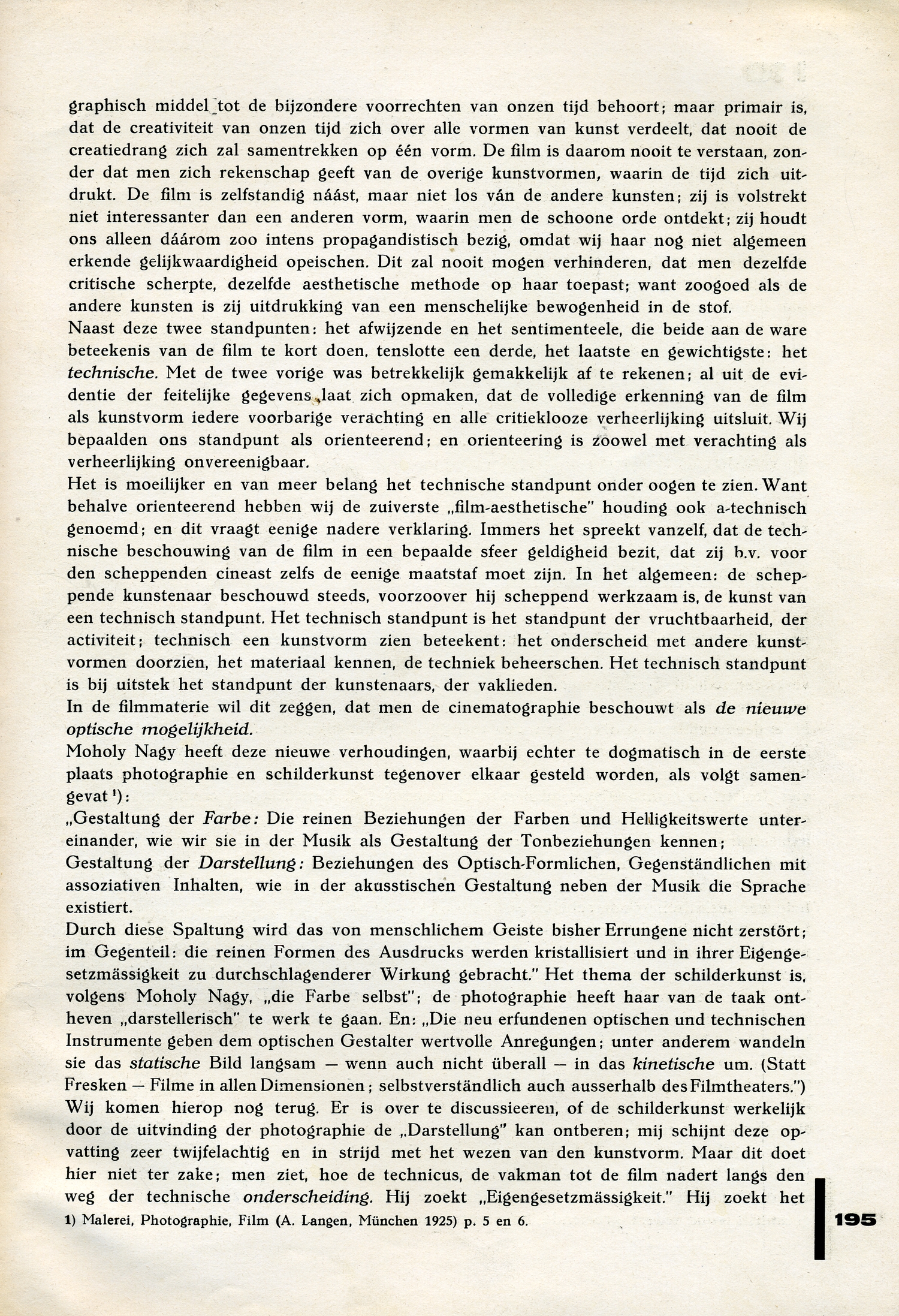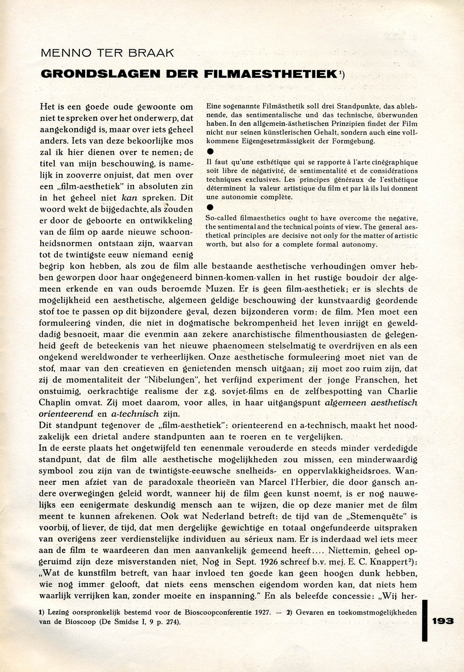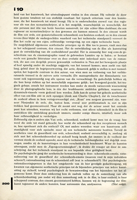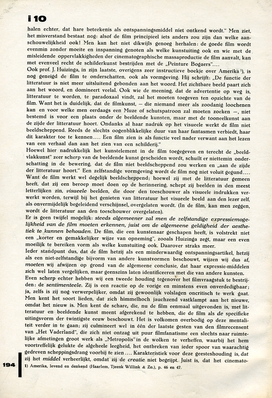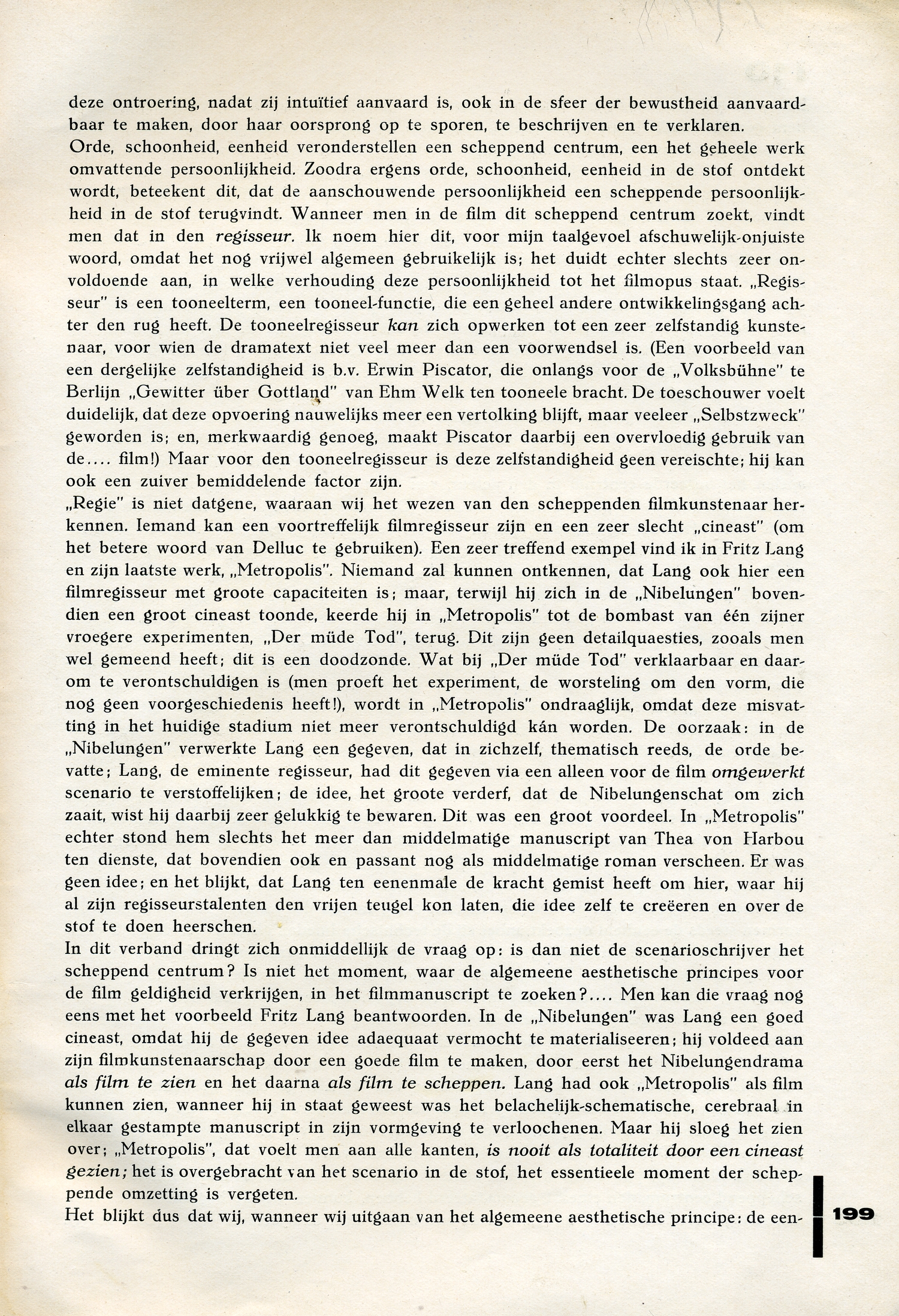In dit verband dringt zich onmiddellijk de vraag op: is dan niet de scenarioschrijver het scheppend centrum? Is niet het moment, waar de algemeene aesthetische principes voor de film geldigheid verkrijgen, in het filmmanuscript te zoeken?....Men kan die vraag nog eens met het voorbeeld Fritz Lang beantwoorden. In de ‘Nibelungen’ was Lang een goed cineast, omdat hij de gegeven idee adaequaat vermocht te materialiseeren; hij voldeed aan zijn filmkunstenaarschap door een goede film te maken, door eerst het Nibelungendrama als film te zien en het daarna als film te scheppen. Lang had ook ‘Metropolis’ als film kunnen zien, wanneer hij in staat geweest was het belachelijk-schematische, cerebraal in elkaar gestampte manuscript in zijn vormgeving te verloochenen. Maar hij sloeg het zien over; ‘Metropolis’, dat voelt men aan alle kanten, is nooit als totaliteit door een cineast gezien; het is overgebracht van het scenario in de stof, het essentieele moment der scheppende omzetting is vergeten.