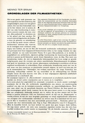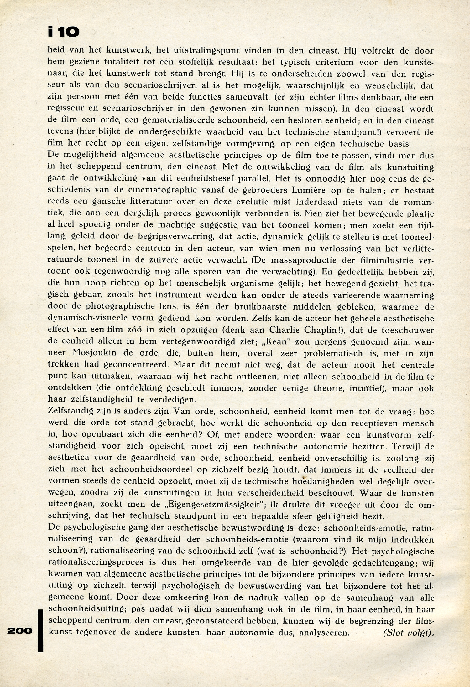 heid van het kunstwerk, het uitstralingspunt vinden in den cineast. Hij voltrekt de door hem geziene totaliteit tot een stoffelijk resultaat: het typisch criterium voor den kunstenaar, die het kunstwerk tot stand brengt. Hij is te onderscheiden zoowel van den regisseur als van den scenarioschrijver, al is het mogelijk, waarschijnlijk en wenschelijk, dat zijn persoon met één van beide functies samenvalt, (er zijn echter films denkbaar, die een regisseur en scenarioschrijver in den gewonen zin kunnen missen). In den cineast wordt de film een orde, een gematerialiseerde schoonheid, een besloten eenheid; en in den cineast tevens (hier blijkt de ondergeschikte waarheid van het technische standpunt!) verovert de film het recht op een eigen, zelfstandige vormgeving, op een eigen technische basis.