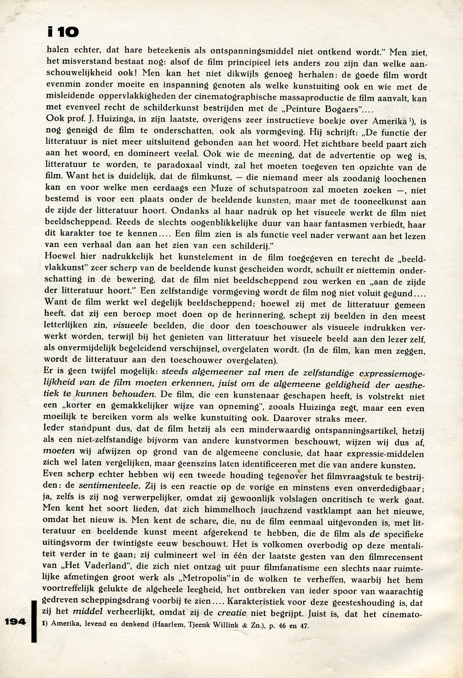 Ook prof. J. Huizinga, in zijn laatste, overigens zeer instructieve boekje over Amerika103, is nog geneigd de film te onderschatten, ook als vormgeving. Hij schrijft: ‘De functie der litteratuur is niet meer uitsluitend gebonden aan het woord. Het zichtbare beeld paart zich aan het woord, en domineert veelal. Ook wie de meening, dat de advertentie op weg is, litteratuur te worden, te paradoxaal vindt, zal het moeten toegeven ten opzichte van de film. Want het is duidelijk, dat de filmkunst, - die niemand meer als zoodanig loochenen kan en voor welke men eerdaags een Muze of schutspatroon zal moeten zoeken -, niet bestemd is voor een plaats onder de beeldende kunsten, maar met de tooneelkunst aan de zijde der litteratuur hoort. Ondanks al haar nadruk op het visueele werkt de film niet beeldscheppend. Reeds de slechts oogenblikkelijke duur van haar fantasmen verbiedt, haar dit karakter toe te kennen....Een film zien is als functie veel nader verwant aan het lezen van een verhaal dan aan het zien van een schilderij.’