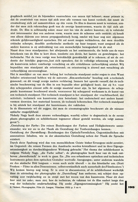 Durch diese Spaltung wird das von menschlichem Geiste bisher Errungene nicht zerstört; im Gegenteil: die reinen Formen des Ausdrucks werden kristallisiert und in ihrer Eigengesetzmässigkeit zu durchschlagenderer Wirkung gebracht.’ Het thema der schilderkunst is, volgens Moholy Nagy, ‘die Farbe selbst’; de photographie heeft haar van de taak ontheven ‘darstellerisch’ te werk te gaan. En: ‘Die neu erfundenen optischen und technischen Instrumente geben dem optischen Gestalter wertvolle Anregungen; unter anderem wandeln sie das statische Bild langsam - wenn auch nicht überall - in das kinetische um. (Statt Fresken - Filme in allen Dimensionen; selbstverständlich auch ausserhalb des Filmtheaters.’) Wij komen hierop nog terug. Er is over te discussieeren, of de schilderkunst werkelijk door de uitvinding der photographie de ‘Darstellung’ kan ontberen; mij schijnt deze opvatting zeer twijfelachtig en in strijd met het wezen van den kunstvorm. Maar dit doet hier niet ter zake; men ziet, hoe de technicus, de vakman tot de film nadert langs den weg der technische onderscheiding. Hij zoekt ‘Eigengesetzmässigkeit.’ Hij zoekt het