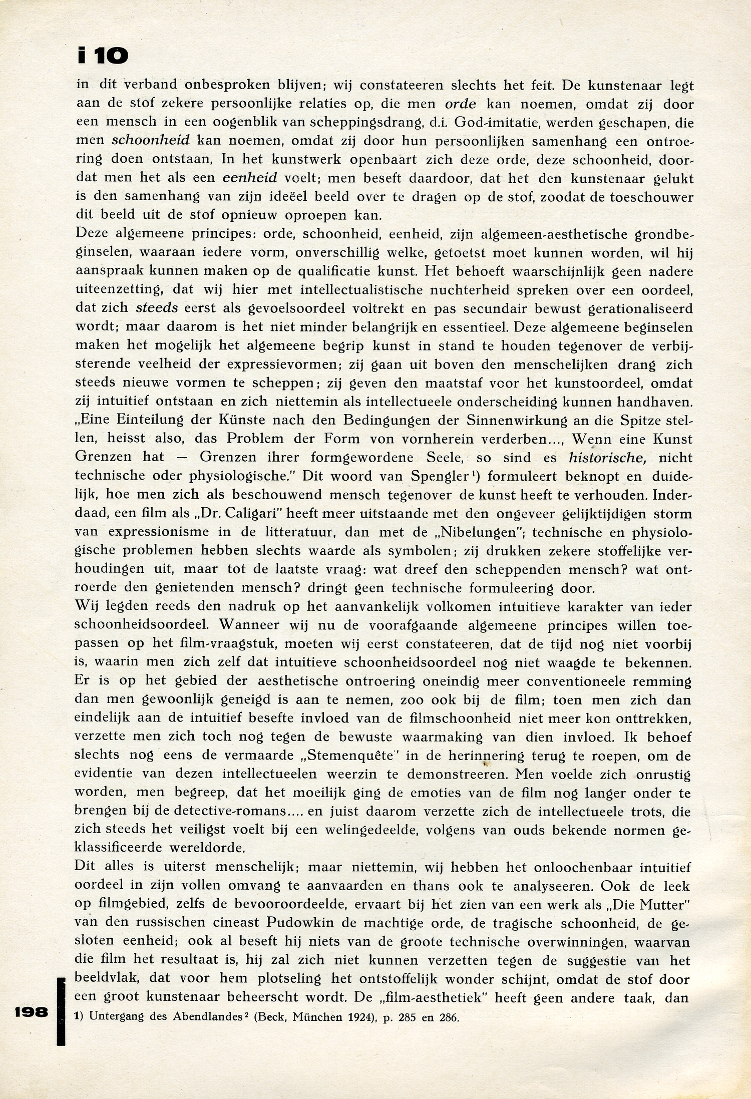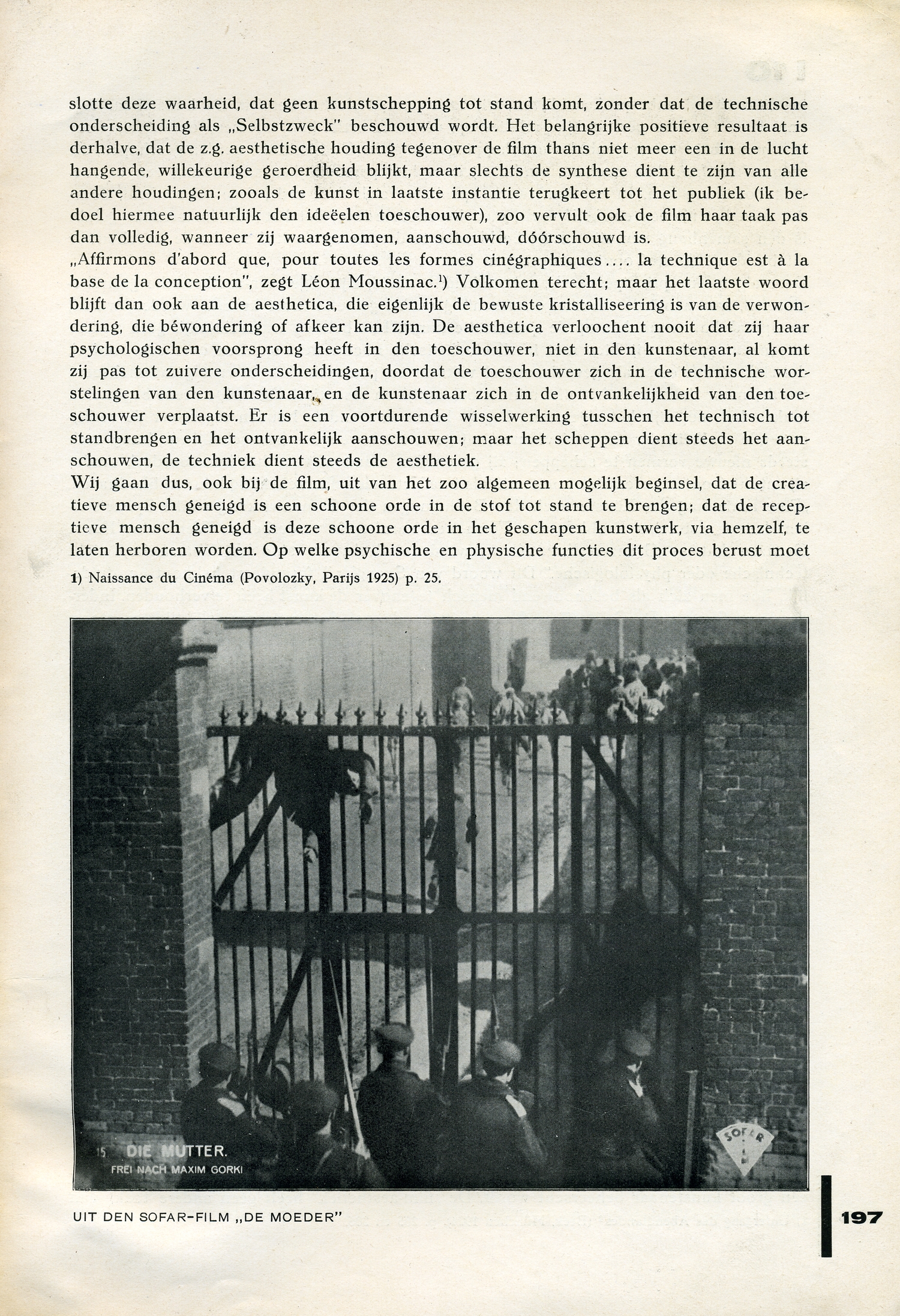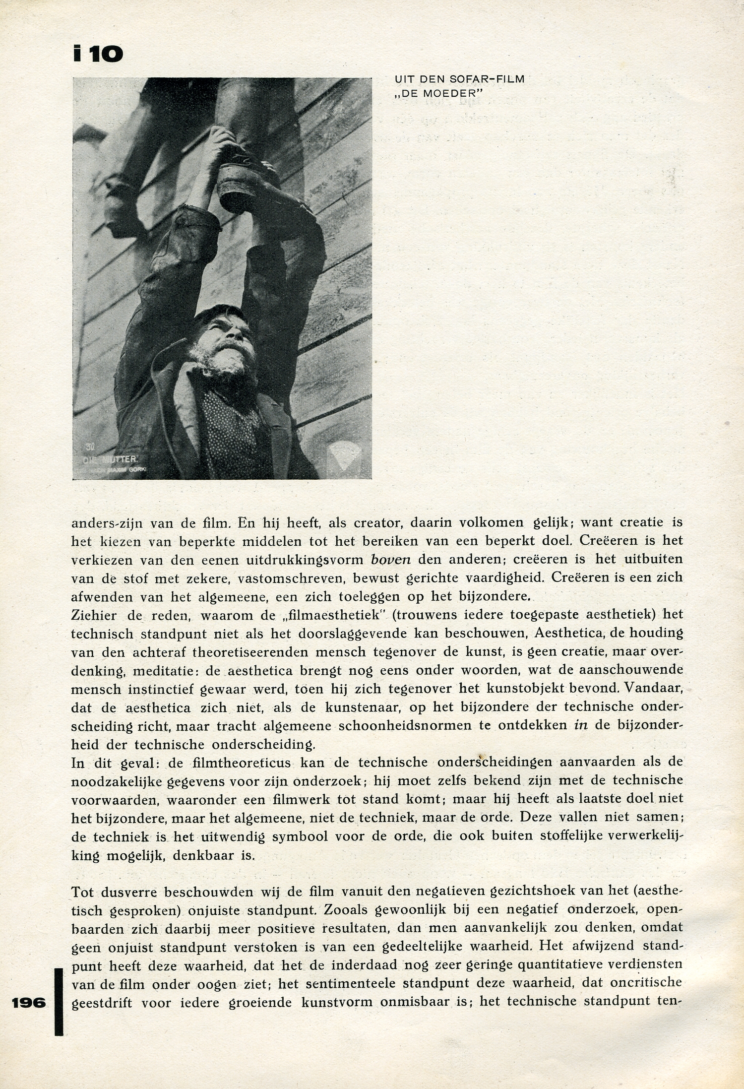 Dit alles is uiterst menschelijk; maar niettemin, wij hebben het onloochenbaar intuitief oordeel in zijn vollen omvang te aanvaarden en thans ook te analyseeren. Ook de leek op filmgebied, zelfs de bevooroordeelde, ervaart bij het zien van een werk als ‘Die Mutter’ van den russischen cineast Pudowkin de machtige orde, de tragische schoonheid, de gesloten eenheid; ook al beseft hij niets van de groote technische overwinningen, waarvan die film het resultaat is, hij zal zich niet kunnen verzetten tegen de suggestie van het beeldvlak, dat voor hem plotseling het ontstoffelijk wonder schijnt, omdat de stof door een groot kunstenaar beheerscht wordt. De ‘film-aesthetiek’ heeft geen andere taak, dan