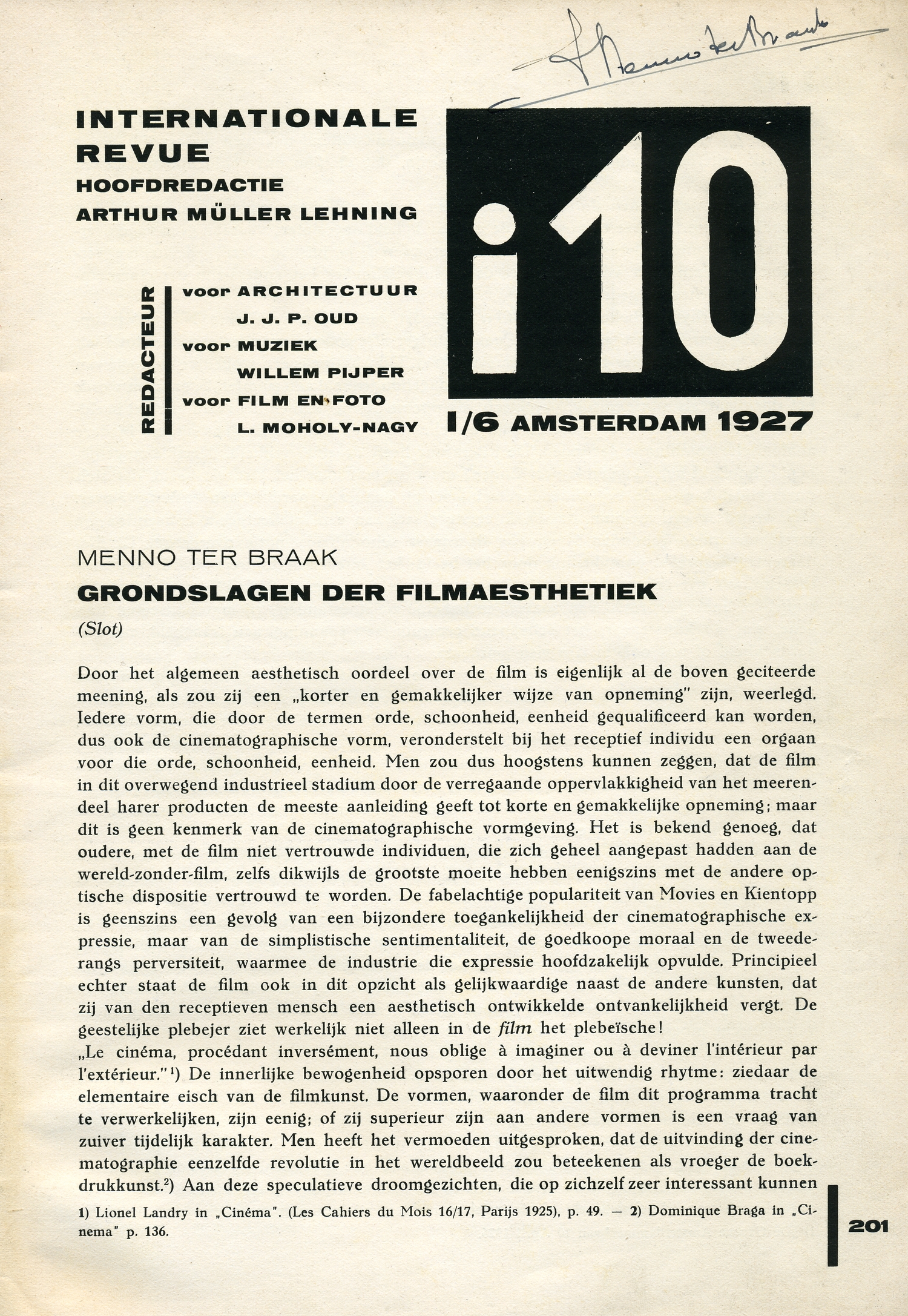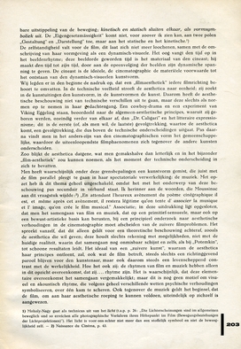 Men heeft waarschijnlijk onder deze grensbepalingen een kunstvorm gemist, die juist met de film parallel pleegt te gaan in haar spectatoriale verwerkelijking: de muziek. Met opzet heb ik dit thema geheel uitgeschakeld, omdat het met het onderwerp van deze beschouwing pas secundair in verband staat. Ik herinner aan de woorden, die Moussinac aan dit vraagstuk wijdde:111 ‘En attendant l'heureux avènement du poème cinégraphique il est, et même après cet avènement, il restera légitime qu'on tente d' associer la musique et l' image, qu'on crée le film musical.’ Associatie; in deze uitdrukking ligt opgesloten, dat men het samengaan van film en muziek, dat op een primitief-sensueele, maar ook op een bewust-artistieke basis kan berusten, bij een principieel onderzoek naar aesthetische verhoudingen in de cinematographie moet afscheiden van de zuivere filmproblemen. Het spreekt vanzelf, dat dit alleen geldt voor een theoretische beschouwing achteraf, zooals de aesthetica die wil geven; deze houdt slechts rekening met mogelijkheden, niet met de huidige realiteit, waarin dat samengaan nog onmisbaar schijnt en zelfs, als bij ‘Potemkin’, tot schoone resultaten leidt. Het ideaal van een ‘zuivere kunst’, waaraan de aesthetica haar principes ontleent, zal, ook wat de film betreft, steeds slechts een richtinggevend parool blijven voor den kunstenaar, maar ook daarom steeds een levenscheppend contrast met de werkelijkheid. Hoe het ook zij: de rhytmen van film en muziek hebben alleen in dit opzicht overeenkomst, dat zij....rhytme zijn. Het is waarschijnlijk, dat deze elementaire overeenkomst het samengaan vergemakkelijkt; maar dit is nog geen motief om visueel en akoustisch rhytme, die volgens geheel verschillende wetten psychische verhoudingen symboliseeren, over één kam te scheren. Ook tegenover de muziek geldt het beginsel, dat de film, om aan haar aesthetische roeping te kunnen voldoen, uiteindelijk op zichzelf is aangewezen.