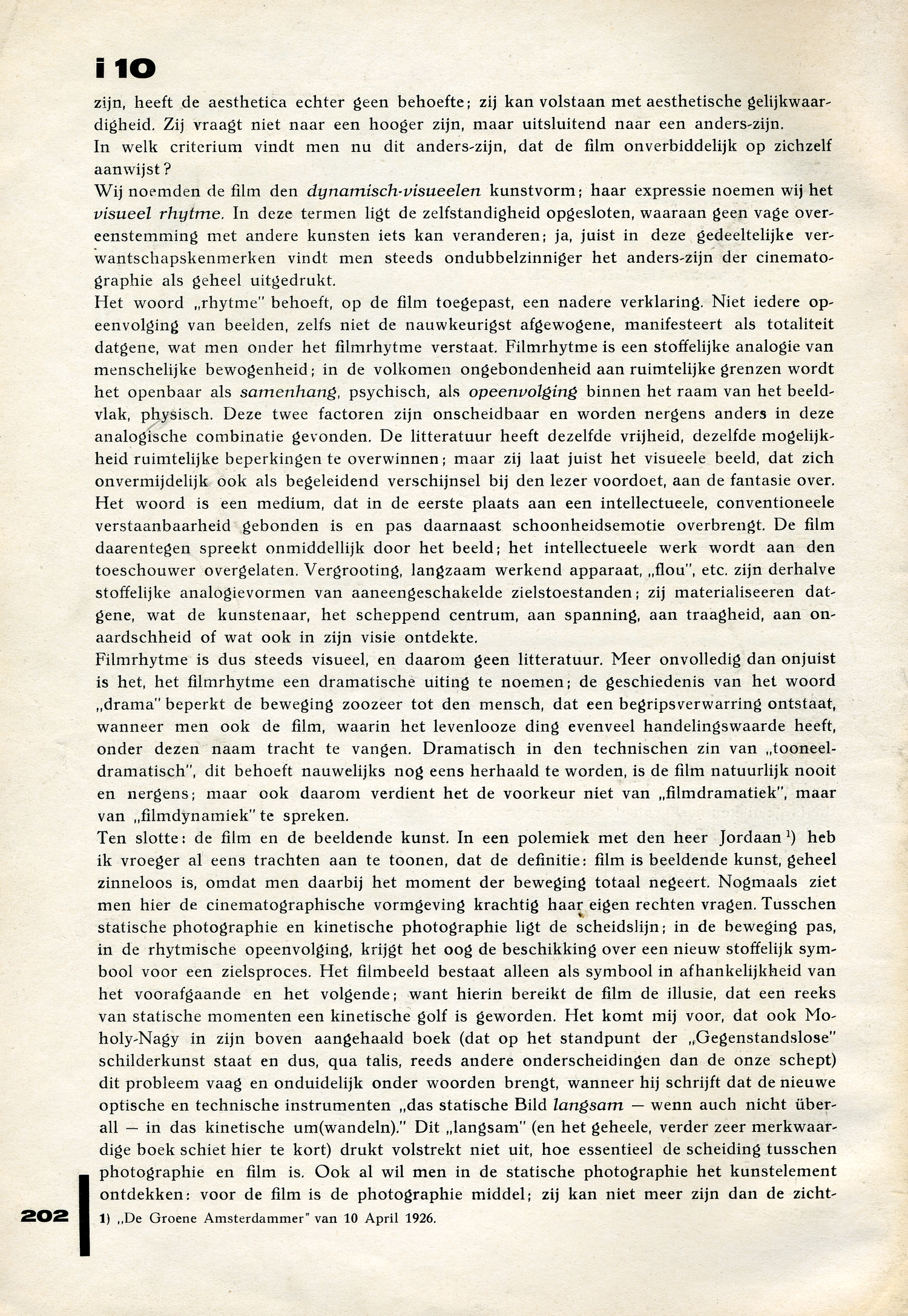 Het woord ‘rhytme’ behoeft, op de film toegepast, een nadere verklaring. Niet iedere opeenvolging van beelden, zelfs niet de nauwkeurigst afgewogene, manifesteert als totaliteit datgene, wat men onder het filmrhytme verstaat. Filmrhytme is een stoffelijke analogie van menschelijke bewogenheid; in de volkomen ongebondenheid aan ruimtelijke grenzen wordt het openbaar als samenhang, psychisch, als opeenvolging binnen het raam van het beeldvlak, physisch. Deze twee factoren zijn onscheidbaar en worden nergens anders in deze analogische combinatie gevonden. De litteratuur heeft dezelfde vrijheid, dezelfde mogelijkheid ruimtelijke beperkingen te overwinnen; maar zij laat juist het visueele beeld, dat zich onvermijdelijk ook als begeleidend verschijnsel bij den lezer voordoet, aan de fantasie over. Het woord is een medium, dat in de eerste plaats aan een intellectueele, conventioneele verstaanbaarheid gebonden is en pas daarnaast schoonheidsemotie overbrengt. De film daarentegen spreekt onmiddellijk door het beeld; het intellectueele werk wordt aan den toeschouwer overgelaten. Vergrooting, langzaam werkend apparaat, ‘flou’, etc. zijn derhalve stoffelijke analogievormen van aaneengeschakelde zielstoestanden; zij materialiseeren datgene, wat de kunstenaar, het scheppend centrum, aan spanning, aan traagheid, aan onaardschheid of wat ook in zijn visie ontdekte.