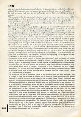 Filmrhytme is dus steeds visueel, en daarom geen litteratuur. Meer onvolledig dan onjuist is het, het filmrhytme een dramatische uiting te noemen; de geschiedenis van het woord ‘drama’ beperkt de beweging zoozeer tot den mensch, dat een begripsverwarring ontstaat, wanneer men ook de film, waarin het levenlooze ding evenveel handelingswaarde heeft, onder dezen naam tracht te vangen. Dramatisch in den technischen zin van ‘tooneeldramatisch’, dit behoeft nauwelijks nog eens herhaald te worden, is de film natuurlijk nooit en nergens; maar ook daarom verdient het de voorkeur niet van ‘filmdramatiek’, maar van ‘filmdynamiek’ te spreken.