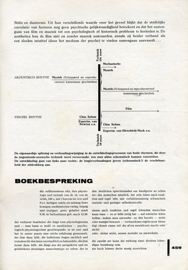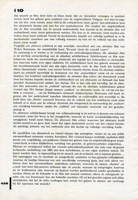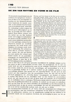 Rhytme en vorm(grens) stellen het visueele schoonheidssymbool, dat zich voor de groote technische ontdekking van 1895 niet kon ontwikkelen, in een eigen synthese samen. De kunst wachtte hier, in tegenstelling tot de muziek om de techniek, om te kunnen groeien....Het samengaan van de muzikale en cinegrafische symbolen in hun gansche volledigheid, waarvan de huidige bioscoop een zeer onvolledige vertooning geeft, laat zich alleen verklaren door het onvoorstelbaar, ondeelbaar substraat, waarvoor de namen ‘rhytme’ en ‘vorm’ niet meer dan poovere teekenen zijn: de psyche, waaraan zij ontspringen, waarvan zij de kenbronnen zijn, waarvan zij kunnen worden geabstraheerd zonder gescheiden te worden. Alleen uit de behoefte is de film mét muziek ontstaan; alleen de scheppende intuïtie van een kunstenaar kan die behoefte veredelen. Of zal het gezichts-orgaan zich aldus ontwikkelen, dat het de stilte verdragen kan, zooals het gehoor de duister- nis verdraagt bij het opnemen van muziek?