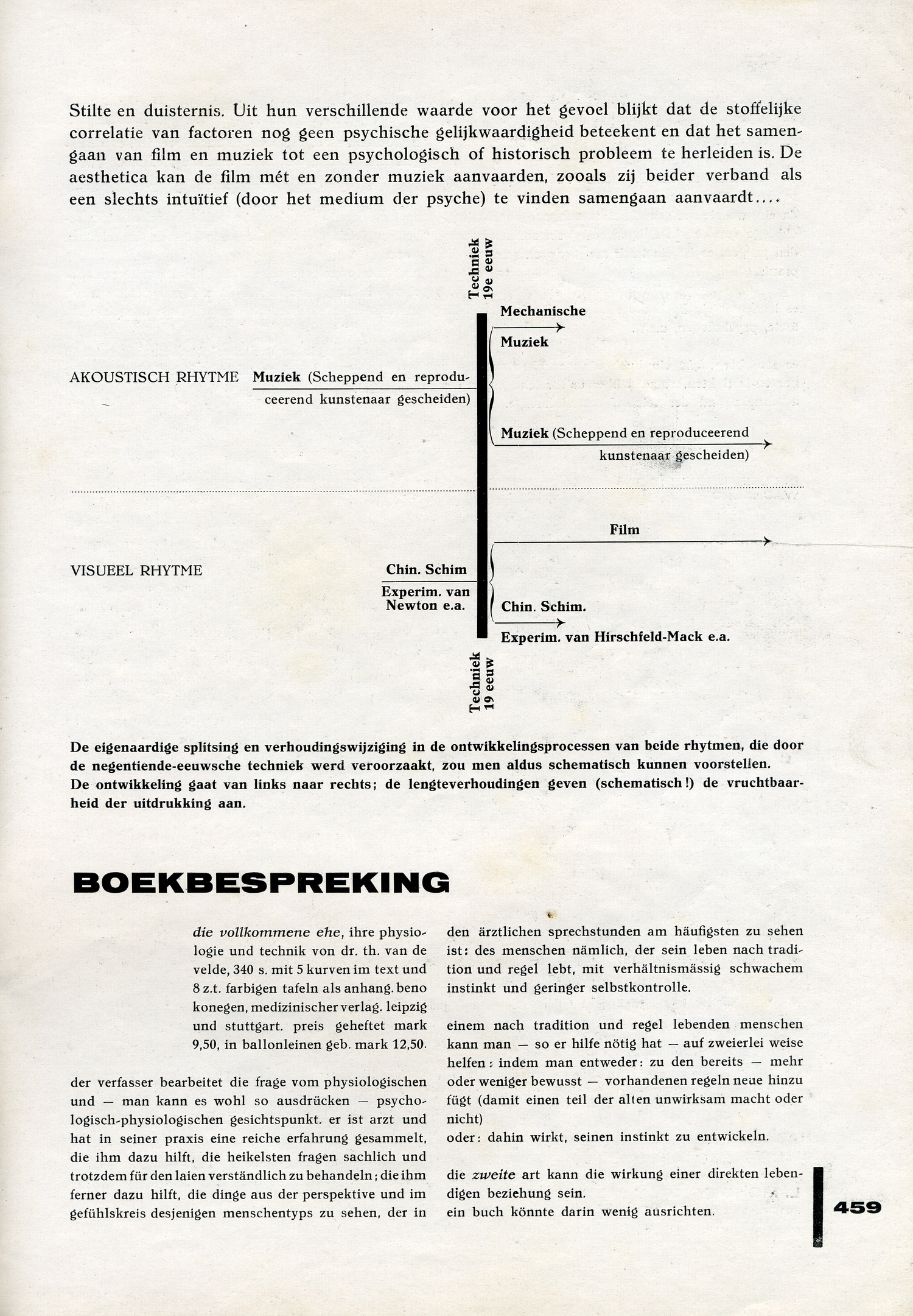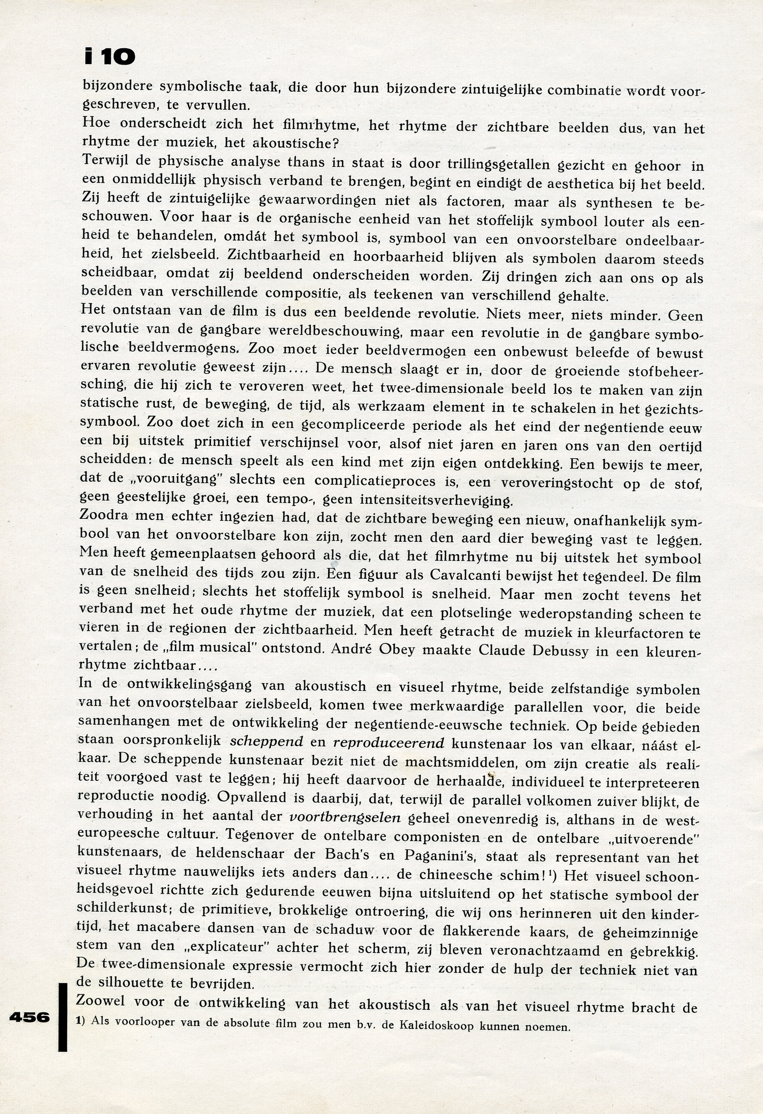 Gezicht en gehoor zijn beeldende symbolen van het onvoorstelbare. In de ontwikkeling hunner stoffelijke uitdrukkingsmaterialen is een analogie te bespeuren, die echter geenszins een identificatie is. De analogie is alleen psychologisch vast te stellen. Akoustisch en visueel rhytme bedienen zich van beeldende eenheden, die analoog door de mechaniseering der uitdrukkingsmiddelen worden omgevormd, zonder daarom gelijktijdig (dit blijkt al uit de historische ontwikkelingsparallel!) of gelijkvormig in hun functioneele verandering te zijn. Elk naïef verband tusschen de zintuigen is een illusie; de vertaling van het akoustisch rhytme in het visueel rhytme (André Obey, Hirschfeld-Mack) blijft een omzetting, die zich slechts door een beperking tot kleur en abstractie den schijn kan geven van een wetmatige aesthetica. De grammaphoon en de film zijn analoge punten in analoge ontwikkelingsgangen; en juist op deze punten openbaart zich het essentieel verschil der symbolen van gezicht en gehoor. Het visueel rhytme heeft het surplus van de grens, het symbool der uitgebreidheid; in de absolute, abstracte, voorstellinglooze film (Ruttman, Richter, Eggeling) is nog slechts een grondverhouding, een ‘muzikale’ basis der zichtbare beweging gegeven, een ‘verloochende’ zichtbaarheid dus.