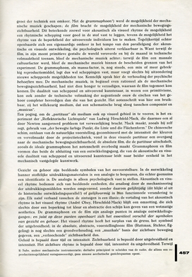 Een poging, om de ‘partituur’ als medium ook op visueel gebied in te voeren, is het experiment der ‘Reflektorische Lichtspiele’ van Ludwig Hirschfeld-Mack, die daarmee een al door Newton aangeroerd probleem tot verwezelijking bracht. Mack maakt, zooals hij zelf zegt, gebruik van ‘der bewegte farbige Punkt, die Linie und die Flächenform.’ De chineesche schim, ontdaan van de natuurlijke voorstelling, gecombineerd met de intensiteit der kleuren en vervolmaakt door de projectietechniek, vond in deze visueele partituur een overgang naar de mechanische bewegingszichtbaarheid, de absolute film, die de partituur uitschakelt, zooals de ideale grammaphoon het notenschrift overbodig maakt. Grammaphoon en film vormen dus beide de afsluiting van een ontwikkelingsgang, die van de akoustische en visueele dualiteit van scheppend en uitvoerend kunstenaar leidt naar beider eenheid in het mechanisch vastgelegde kunstwerk.
