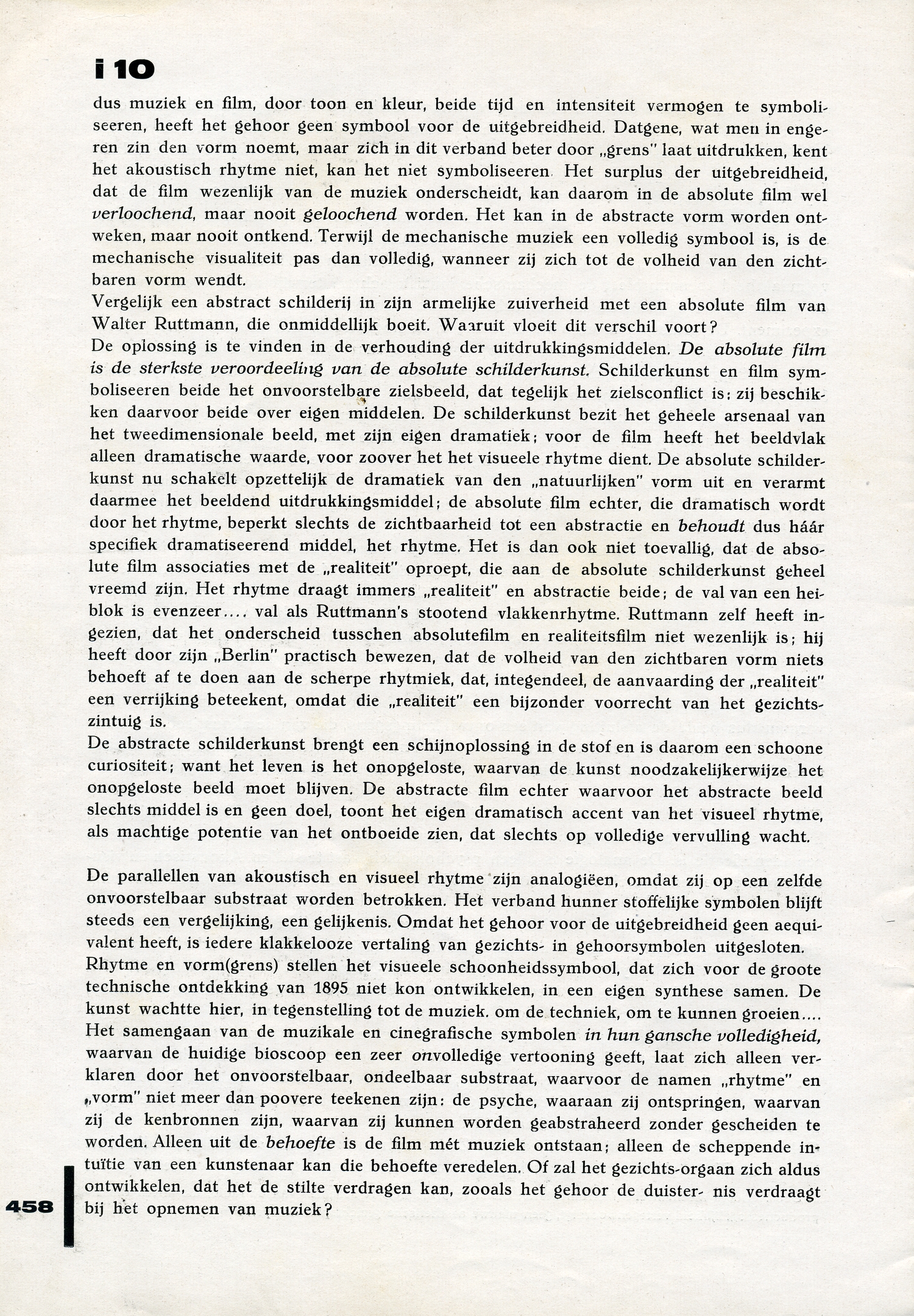 De abstracte schilderkunst brengt een schijnoplossing in de stof en is daarom een schoone curiositeit; want het leven is het onopgeloste, waarvan de kunst noodzakelijkerwijze het onopgeloste beeld moet blijven. De abstracte film echter waarvoor het abstracte beeld slechts middel is en geen doel, toont het eigen dramatisch accent van het visueel rhytme, als machtige potentie van het ontboeide zien, dat slechts op volledige vervulling wacht.